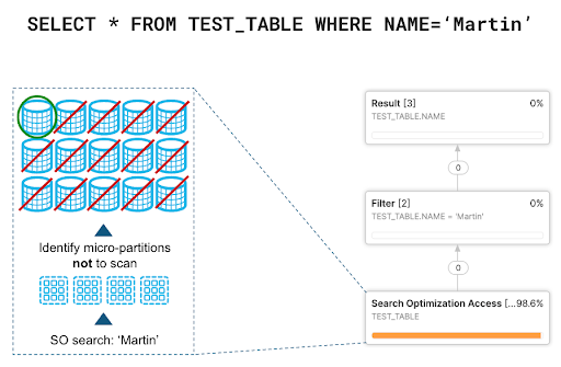 Before looking at improvements, let’s review how the Search Optimization Service (SOS) works: it creates an optimized data structure, called the search access path, that, given a value, prunes the micro-partitions (MPs) that do not contain it. In our sample query that looks for the name “Martin” in a table, SOS will identify micro-partitions that do not contain that string, and instead of a full table scan, will scan only the remaining few partitions, saving a lot of time and resources.