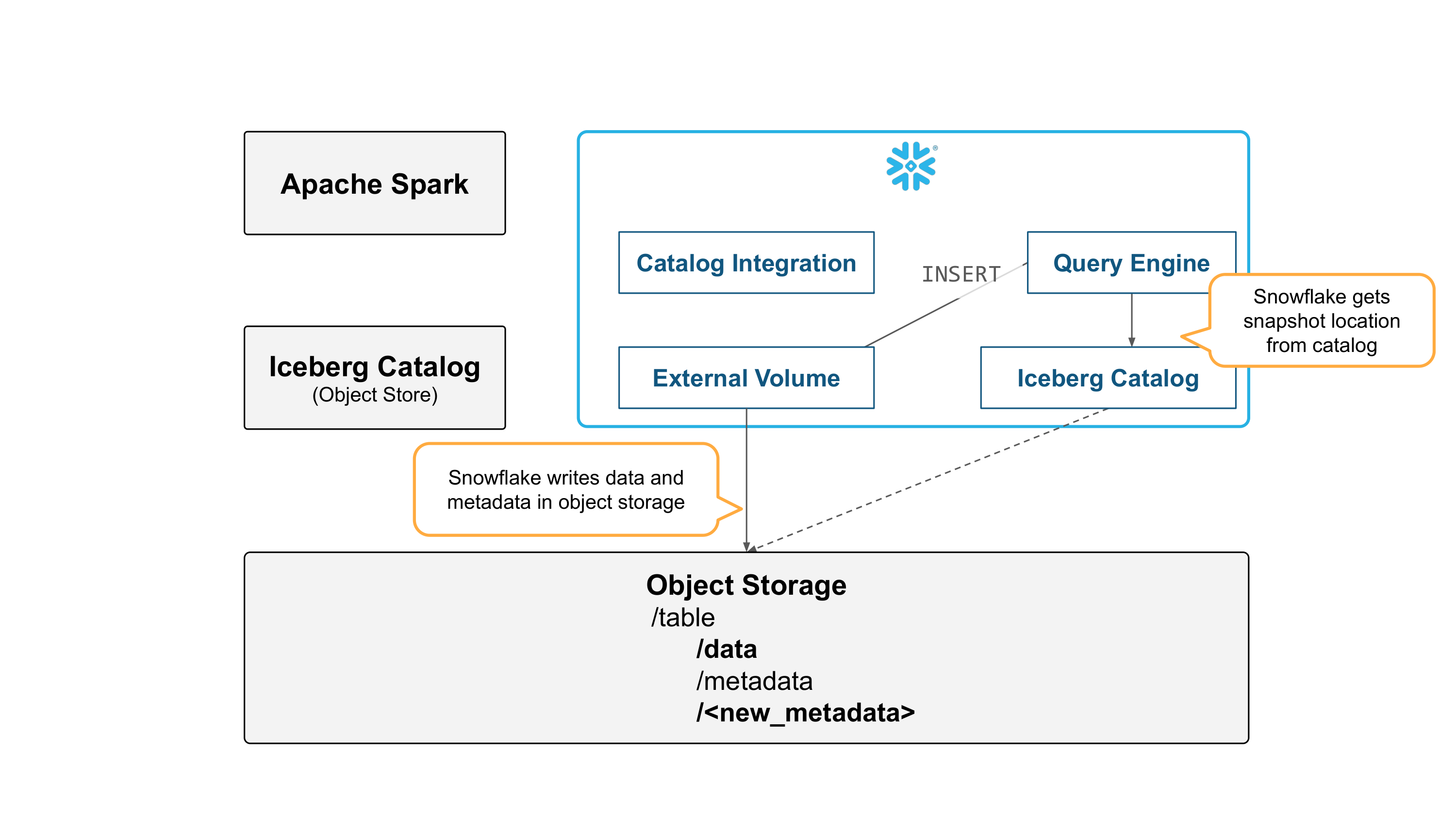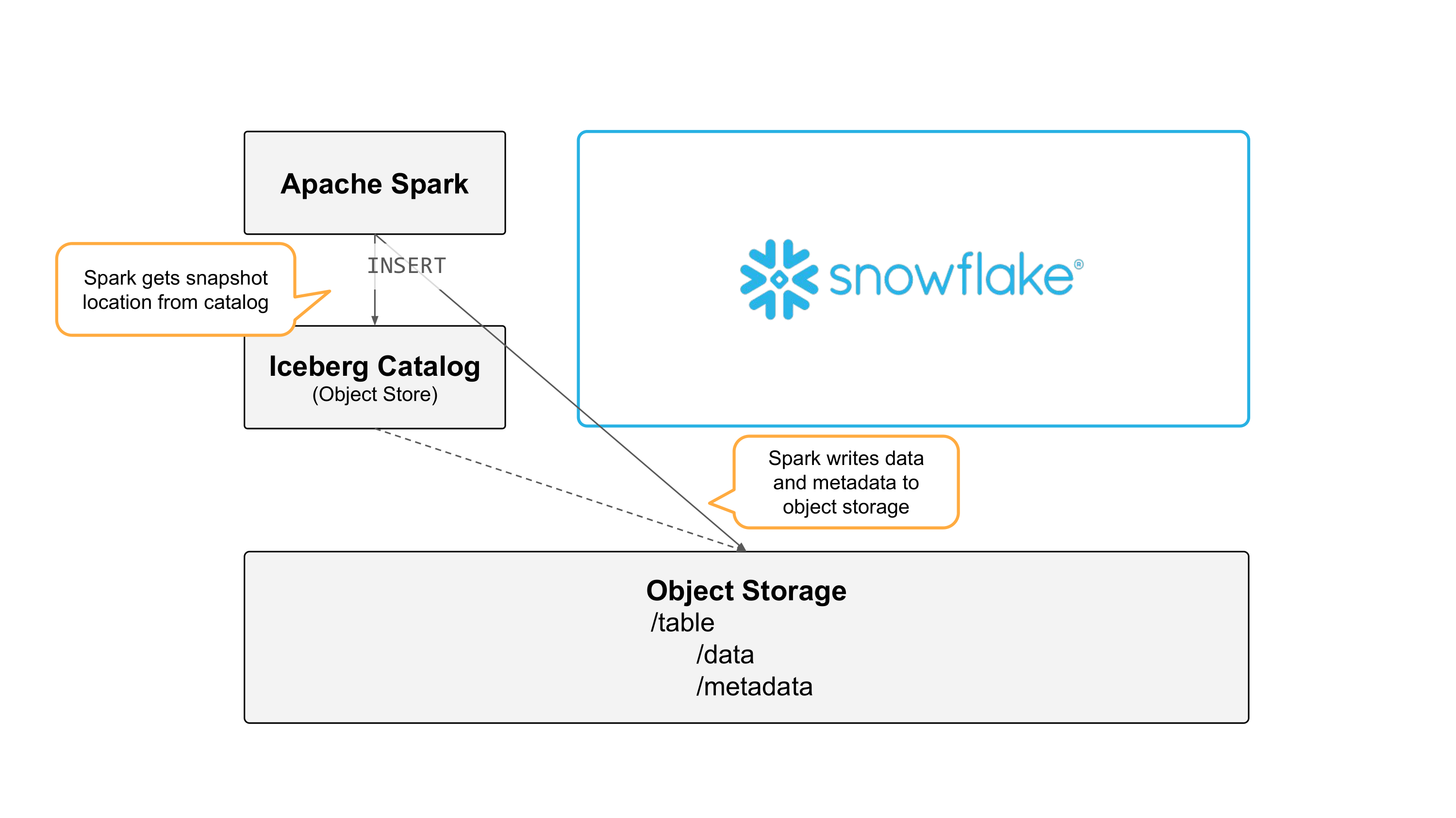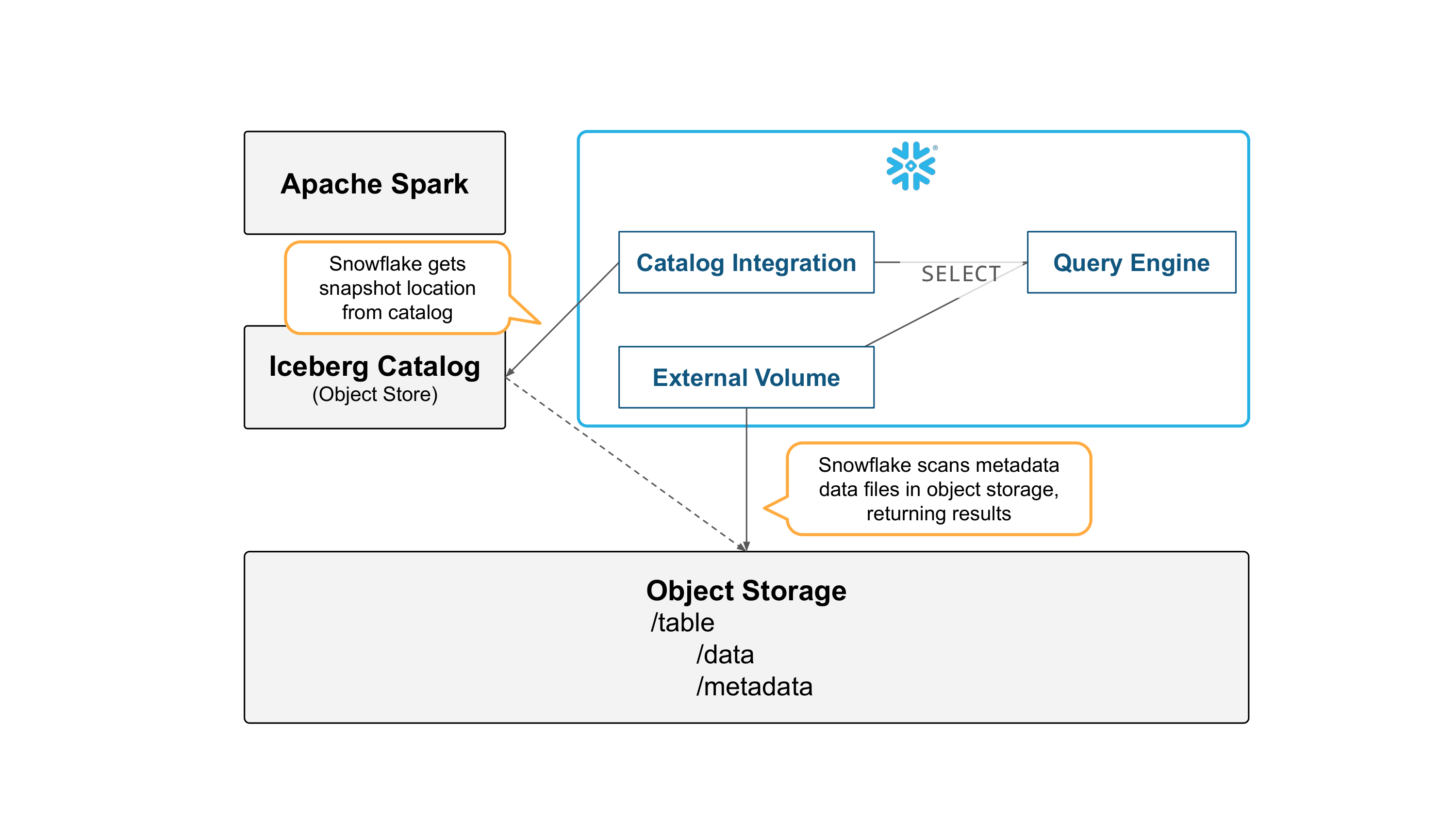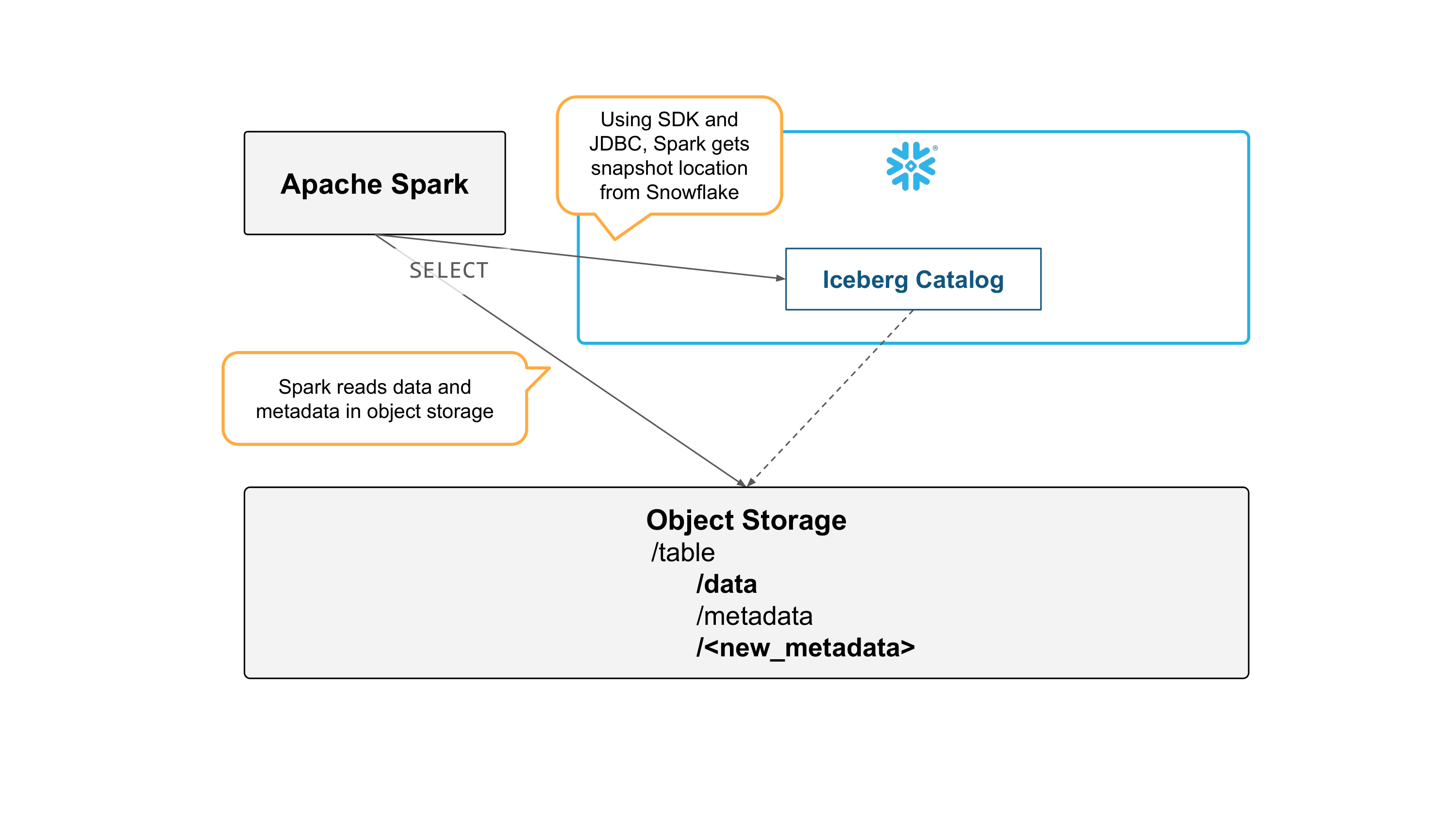 Spark can read the table by getting snapshot information from Snowflake, and reading metadata and data files directly from object storage.
