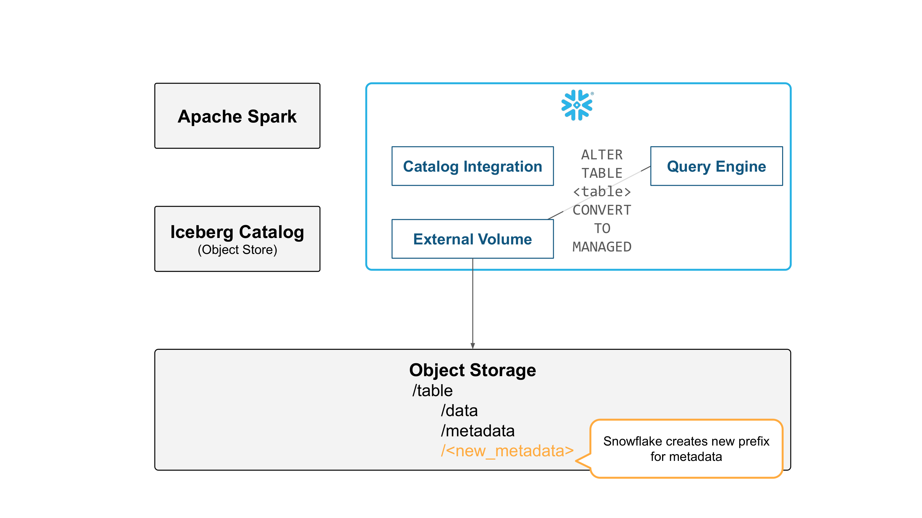 If you convert the table’s catalog to Snowflake, no Parquet data files are moved or rewritten. Snowflake only generates metadata, making this an inexpensive operation in comparison to a full copy or rewrite of the table.