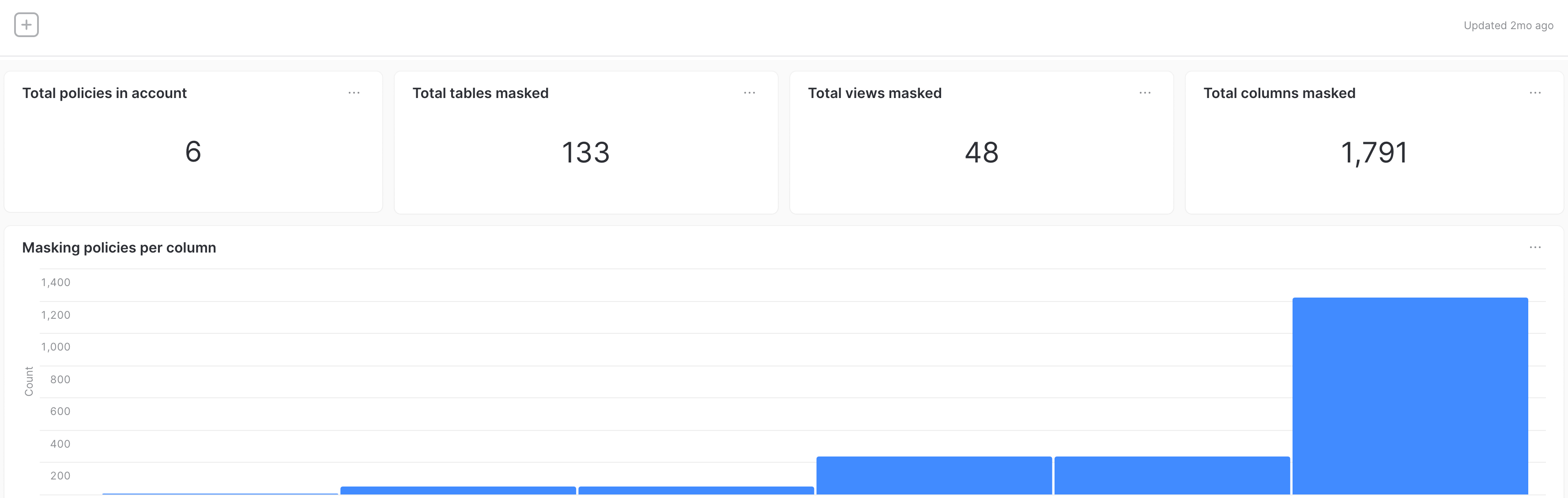 Figure 1 shows a dashboard example we created using Snowsight that provides information about the policies and columns we masked. These are the questions the dashboard answers.