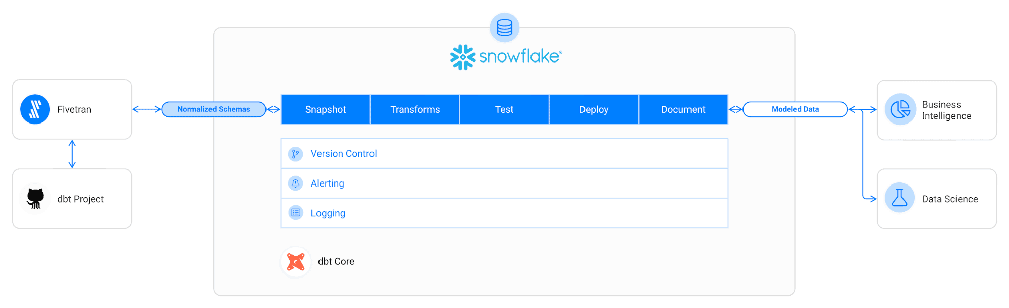 The following figure shows the Fivetran, dbt and, Snowflake pipeline.