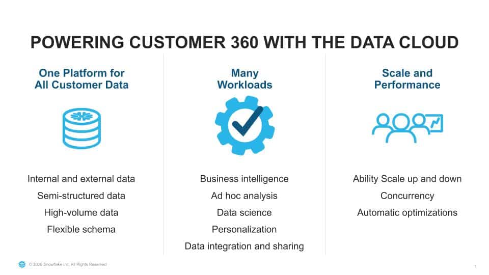In order to build a true 360-degree view of your customers, the first step is to break the data silos and consolidate your data into a single data platform that can support different kinds of data. Snowflake can efficiently and securely store all data, regardless of its source, format, or velocity. This means marketers can access from a single location—the Data Cloud—streaming IoT data alongside web clicks and product orders. In addition, having a centralized repository also makes it very easy to enforce data security policies to limit access to sensitive information such as PII data.