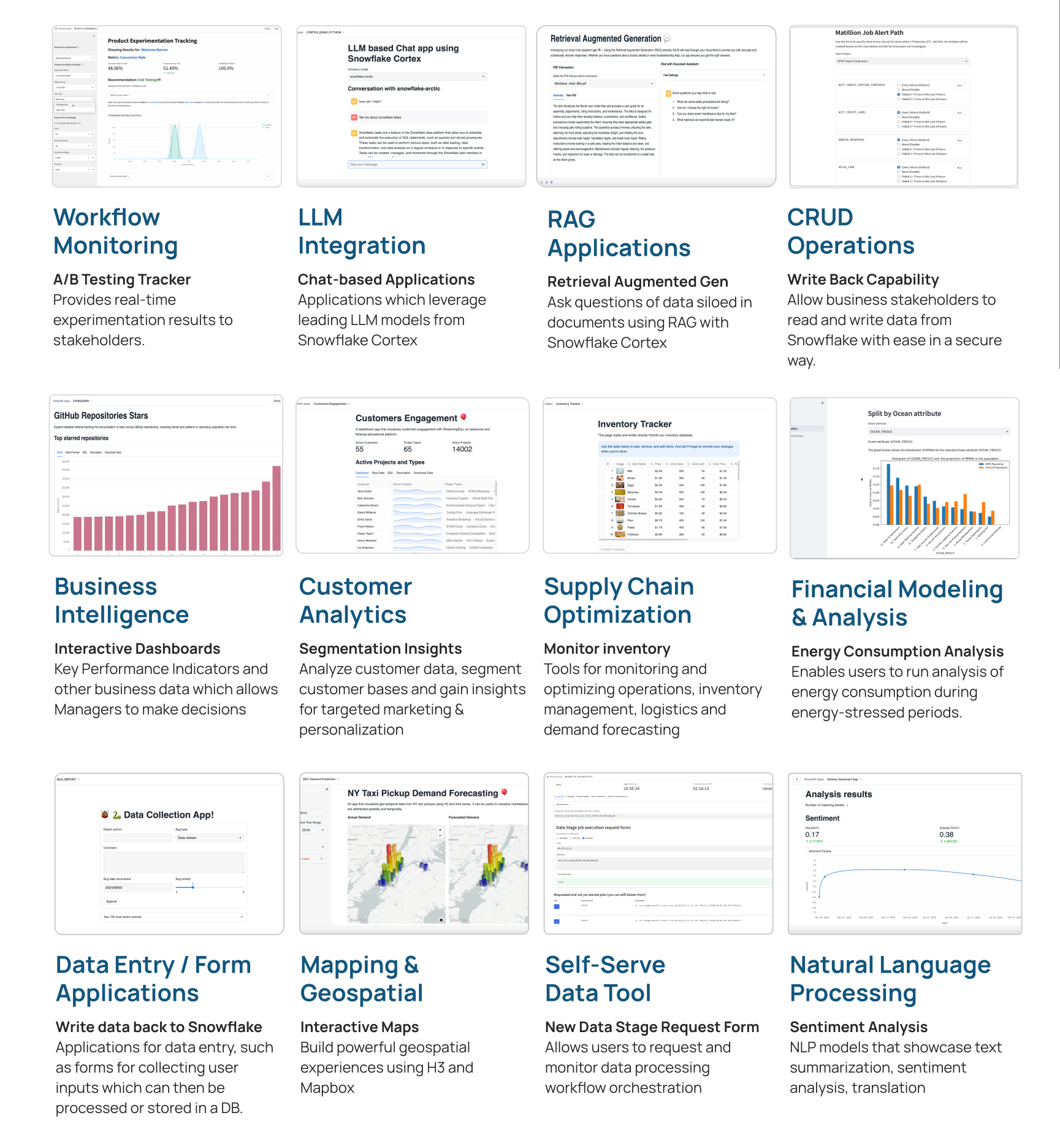 Since the public preview of Streamlit in Snowflake (“SiS”) and its subsequent release to general availability across commercial clouds (AWS, Azure, GCP) — we have seen tremendous adoption among our customers with more than 11,000 new Streamlit apps were created in the just the last 30 days (as of June 1st, 2024). Streamlit in Snowflake apps can be used for a variety of use cases, some of which are shown below.