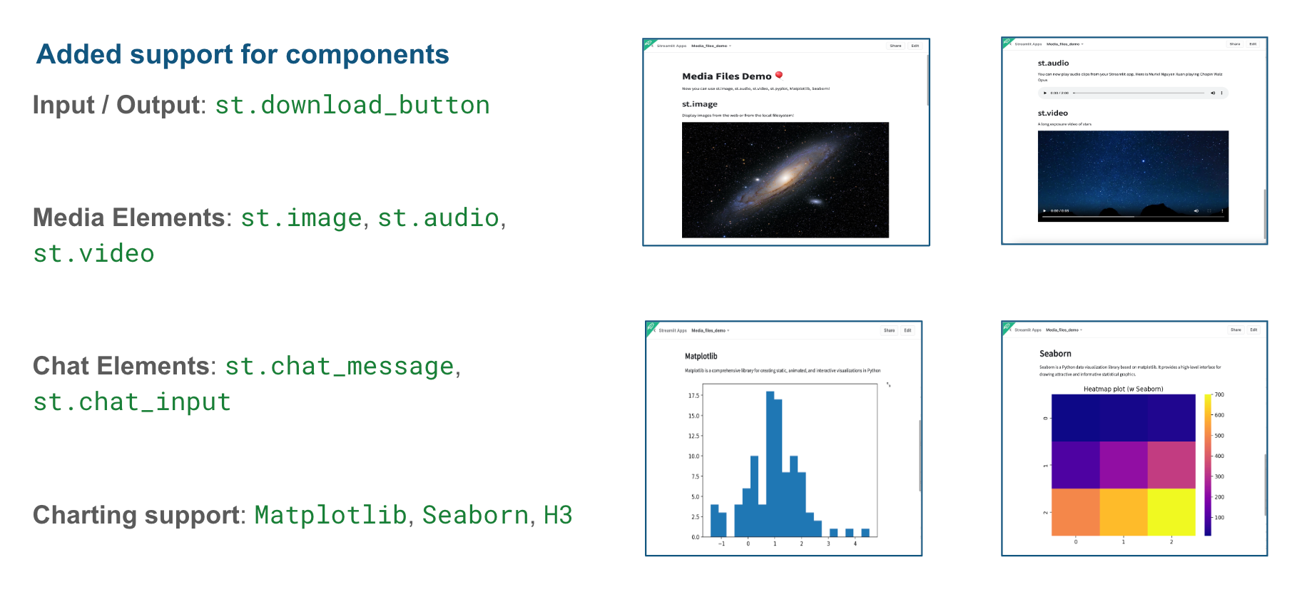 In the past couple of quarters, we have been making improvements to support the same experience in SiS that customers have when using open source Streamlit. Updates include support for the following open source components: