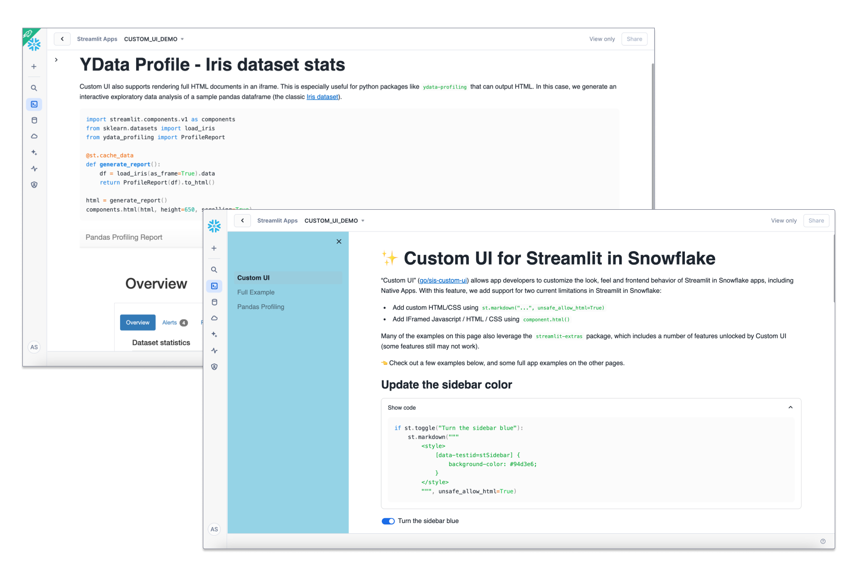 With a robust foundation for secure, scalable data app development and a commitment to ongoing innovation, Streamlit in Snowflake offers you a multitude of ways to explore and interact with your data. To help you get started, we’re also open sourcing a set of curated examples, which an app builder can take and run in their own Snowflake account (all setup steps included)! Explore example apps and tutorials to get hands-on in our Examples Github repo.