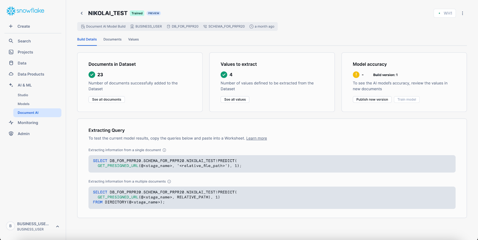 Da Document AI auf Snowflake Cortex AI basiert, werden alle Vorgänge auf verwalteten GPUs ausgeführt und das Modell wird direkt in Snowflake gehostet. Einfach das Modell auswerten, bei Bedarf fine-tunen und dann skalierbar arbeiten, ohne dass GPUs getestet, gesichert, bereitgestellt oder aufgerüstet werden müssen. Snowflake kümmert sich um die gesamte Infrastruktur für Sie, mit der Möglichkeit, die Operationalisierung in Pipelines genau dort vorzunehmen, wo sich Ihre Daten befinden.