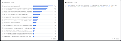 Administrator:innen können sich zu diesen Kennzahlen noch mehr Informationen ansehen, sich mehr Details zu Objekten – nach Nutzung oder Credits sortiert – anzeigen lassen und die zugrundeliegenden SQL-Skripts prüfen, mit denen diese Einblicke erstellt werden. Snowflake verpflichtet sich zu umfassender Transparenz. Daher können Sie im Cost Management Interface in Snowsight sogar die SQL-Skripte für Ihre eigenen Dashboards individuell konfigurieren.