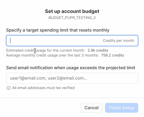Es ist ganz einfach, ein Budget auf Kontoebene festzulegen. Wenn Sie über Private Preview für Cost Management Interface verfügen, gehen Sie in Snowsight zu Admin > Cost Management > Budgets (Preview) und geben Sie basierend auf ihrer aktuellen und prognostizierten Nutzung ein Ausgabenlimit ein. Wenn Sie keine Private Preview für das Cost Management Interface haben, gehen Sie zu Admin > Usage > Budget (Previews). Wir stellen Ihnen einige Informationen zu Ihren Creditausgaben der letzten drei Monate und eine Prognose Ihrer aktuellen Ausgaben (falls Sie das Budget auf Kontoebene im laufenden Monat aktivieren) zur Verfügung, um Sie beim Festlegen Ihres Ausgabenlimits zu unterstützen.