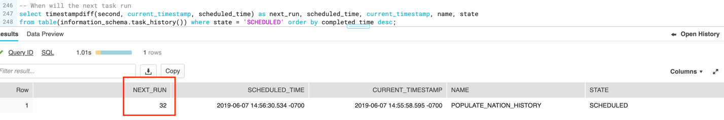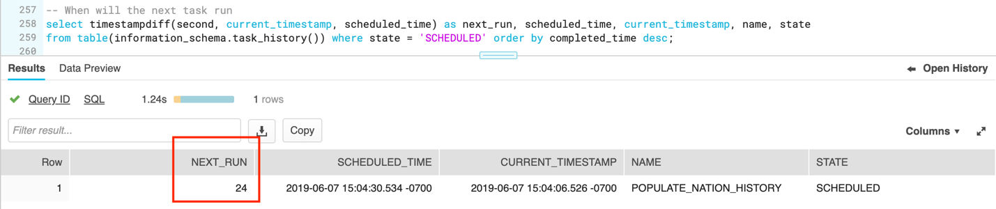 from table(information_schema.task_history()) where state = 'SCHEDULED' order by completed_time desc;The following figure shows the task will run in 24 seconds, so let’s wait until it executes to check the NATION_HISTORY table.