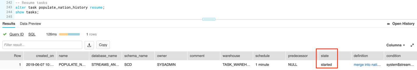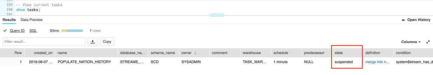 Wait for the task to execute the stream and then run the following command to look at the NATION_HISTORY table: