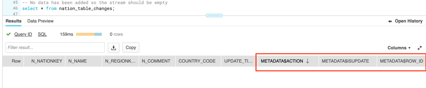 Again, because you executed a DML statement using the stream on the NATION table, the stream was purged to ensure you don’t process the same changed data twice. To verify this, run the following command: