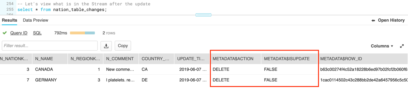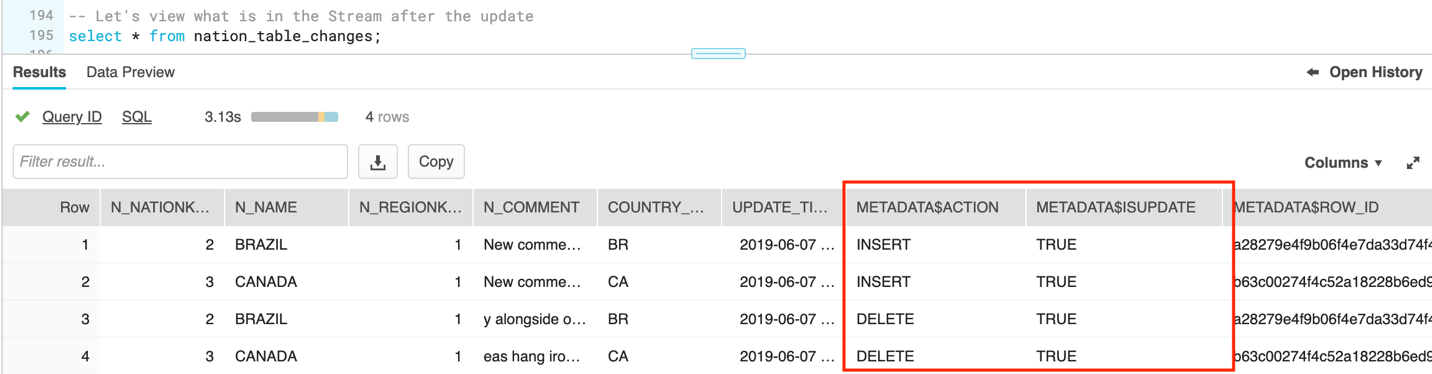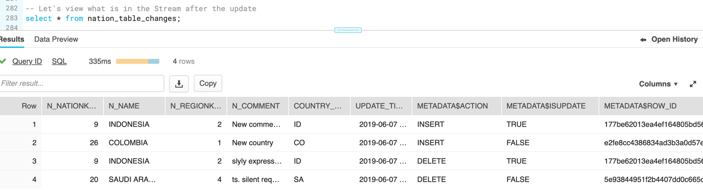 select * from nation_table_changes;In the following figure, notice the METADATA$ISUPDATE column contains TRUE. You updated two records in the NATION table, so there are four rows in the stream.