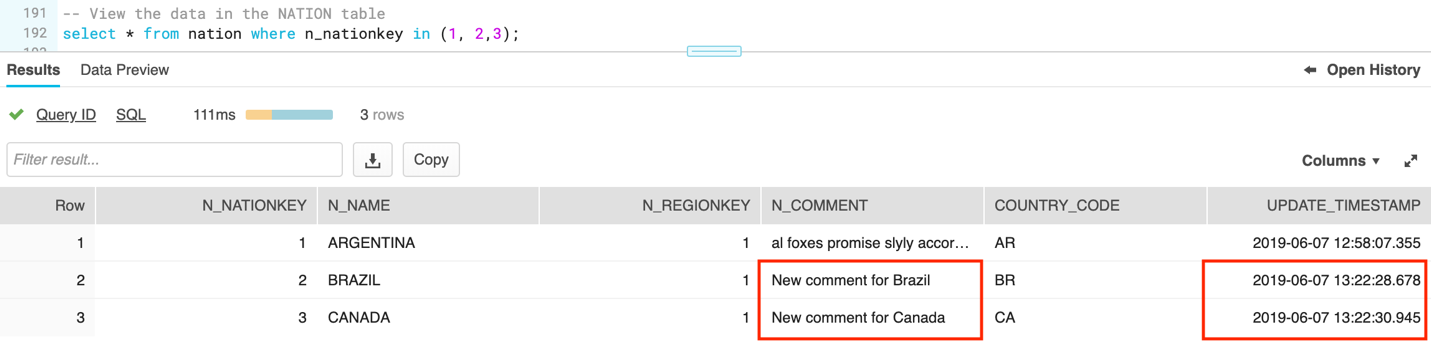 select * from nation where n_nationkey in (1, 2,3);In the following figure, notice the updated values in the N_COMMENT and UPDATE_TIMESTAMP columns for N_NATIONKEY 2 and N_NATIONKEY 3.
