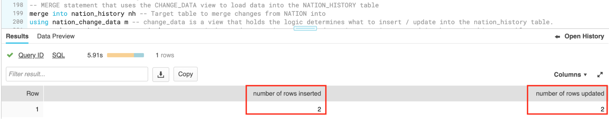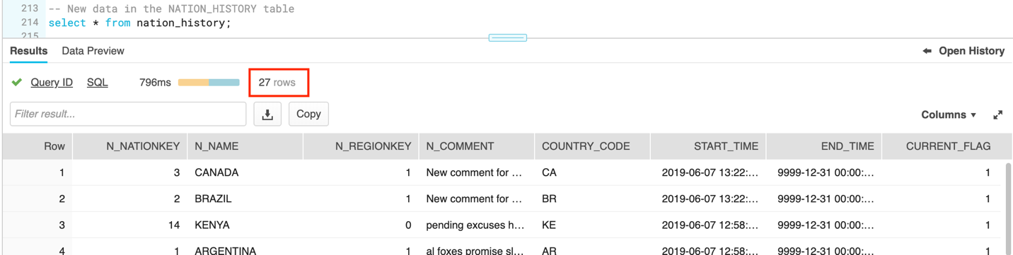 Next, merge the stream data into the NATION_HISTORY table by executing the MERGE statement again: