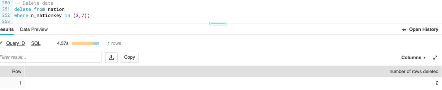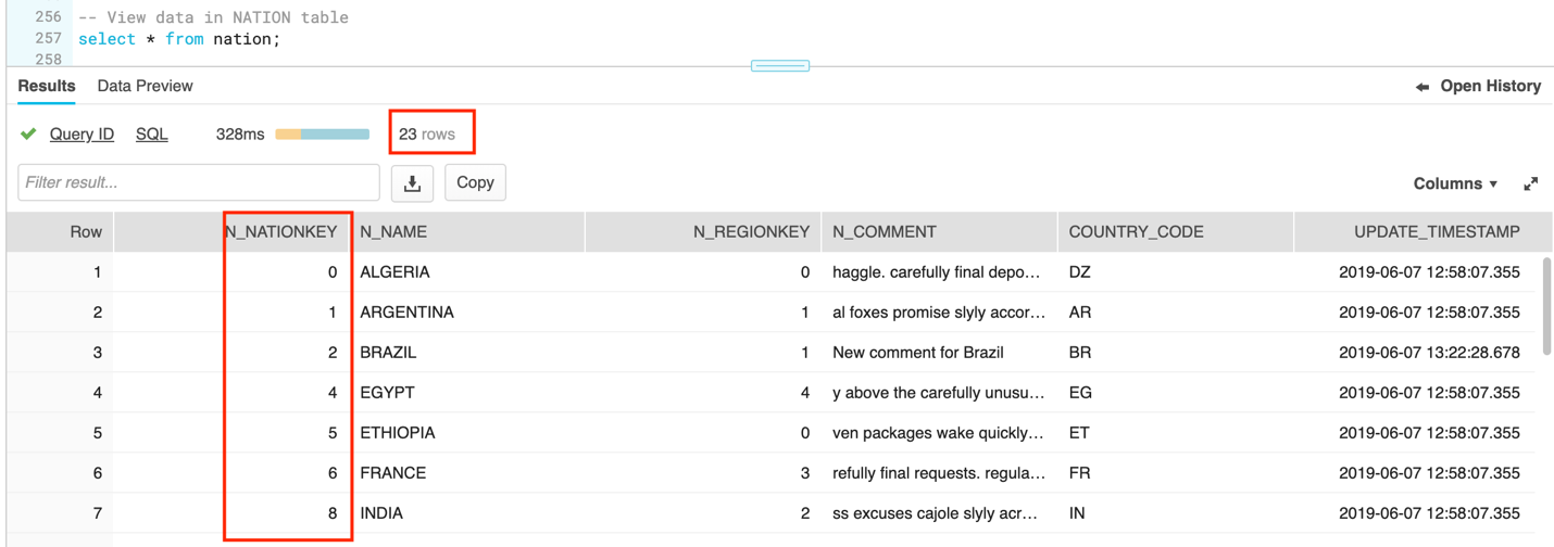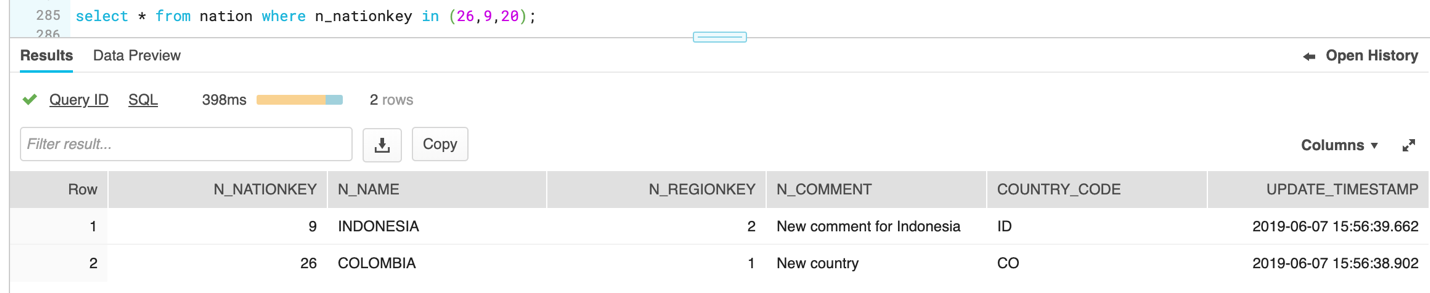 So far, you’ve performed individual DML actions on the NATION table. Next, run the following command to insert Colombia (N_NATIONKEY 26), update Indonesia (N_NATIONKEY 9), and delete Saudi Arabia (N_NATIONKEY 20) all at once: