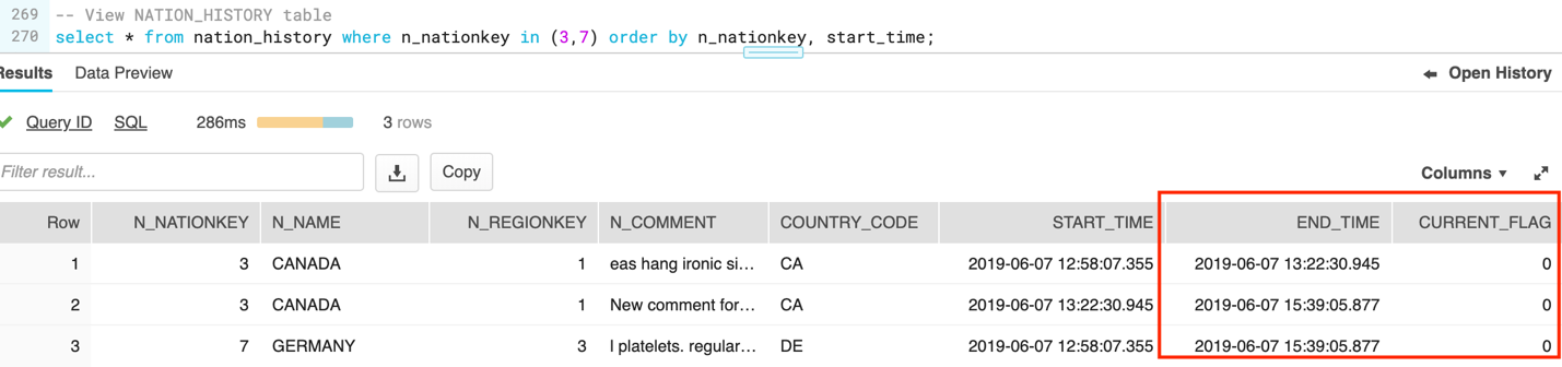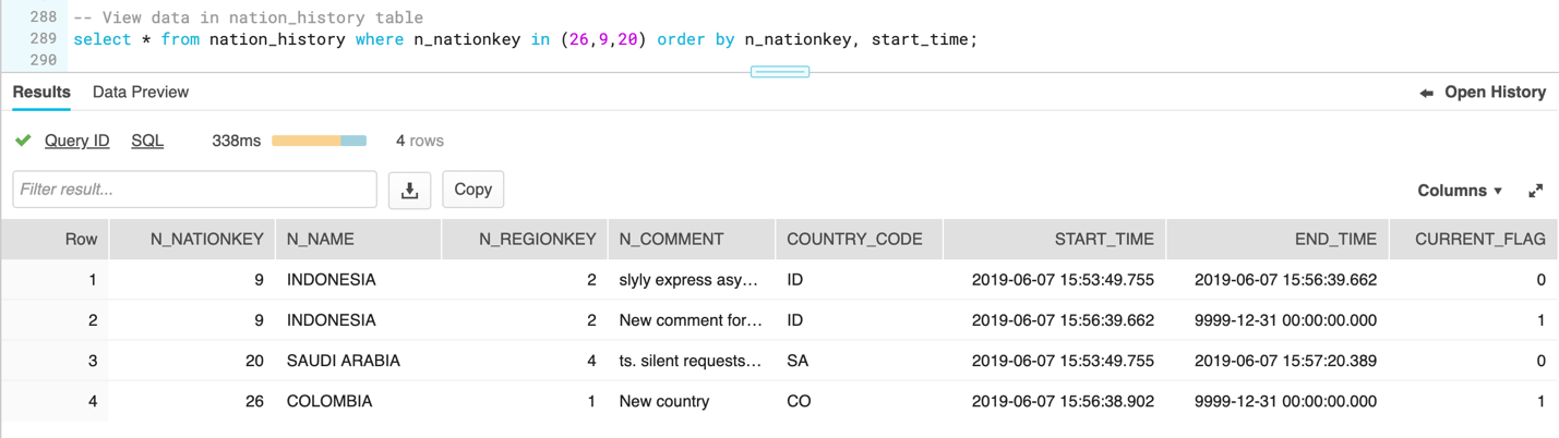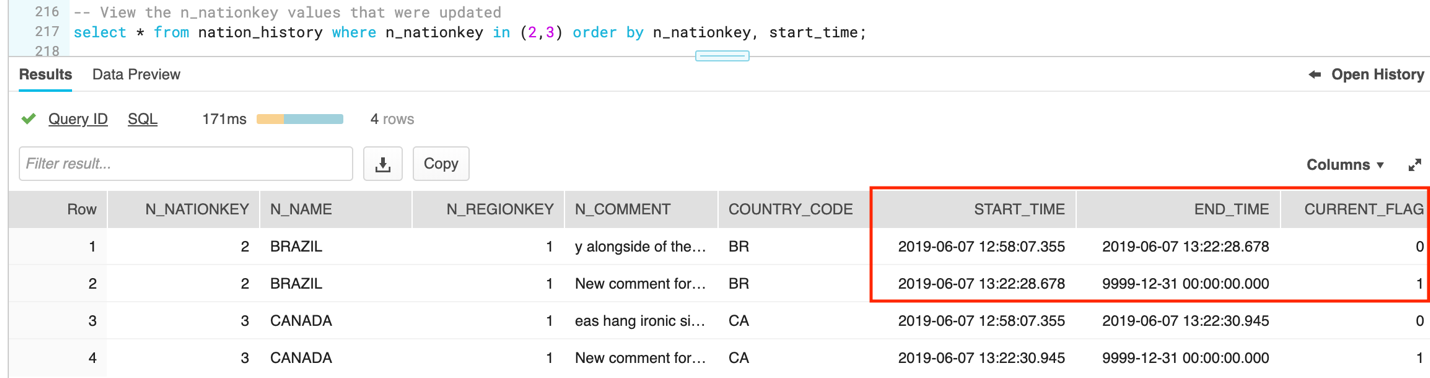 As shown in the following figure, filtering for only the N_NATIONKEY values you updated shows how records are stamped for START_TIME, END_TIME, and CURRENT_TIME.