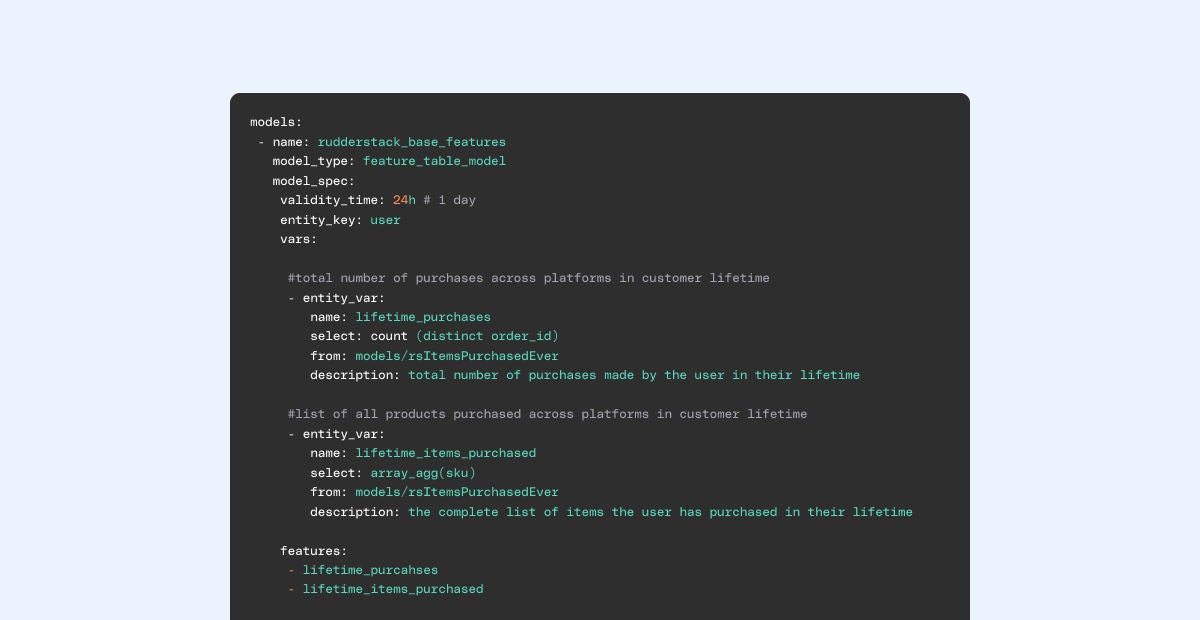 Instead of spending weeks writing complex SQL or updating models in multiple places, data teams using Profiles can write simple feature definitions, and RudderStack will automatically compute the values natively in their Data Cloud environment.