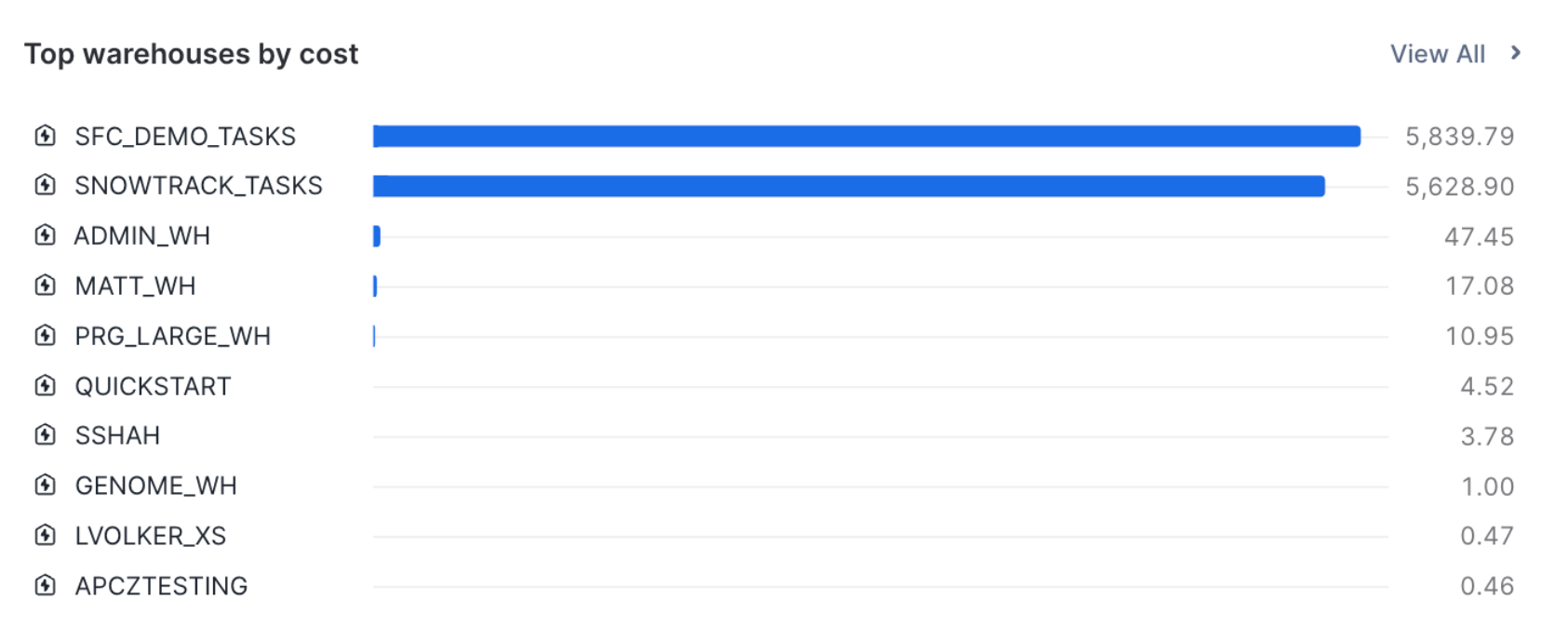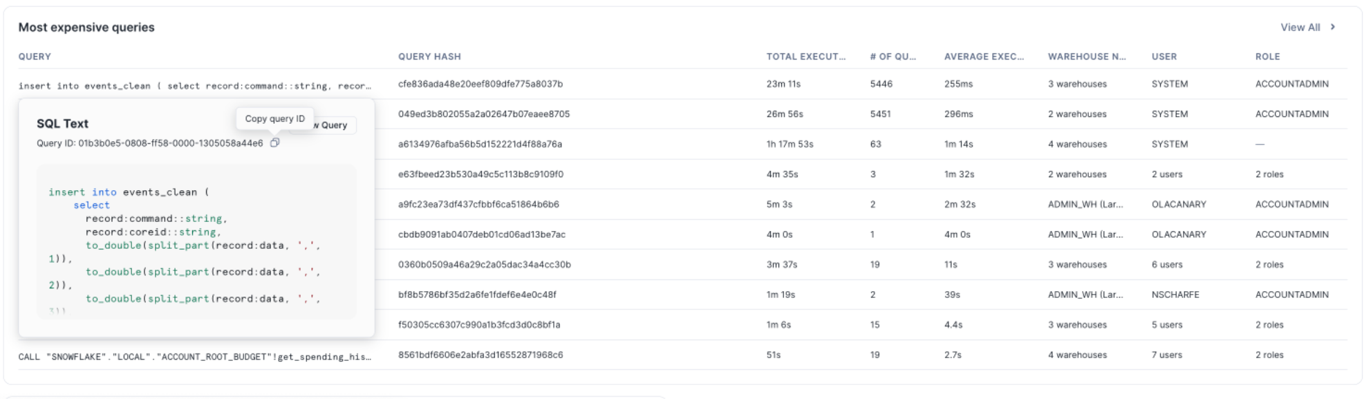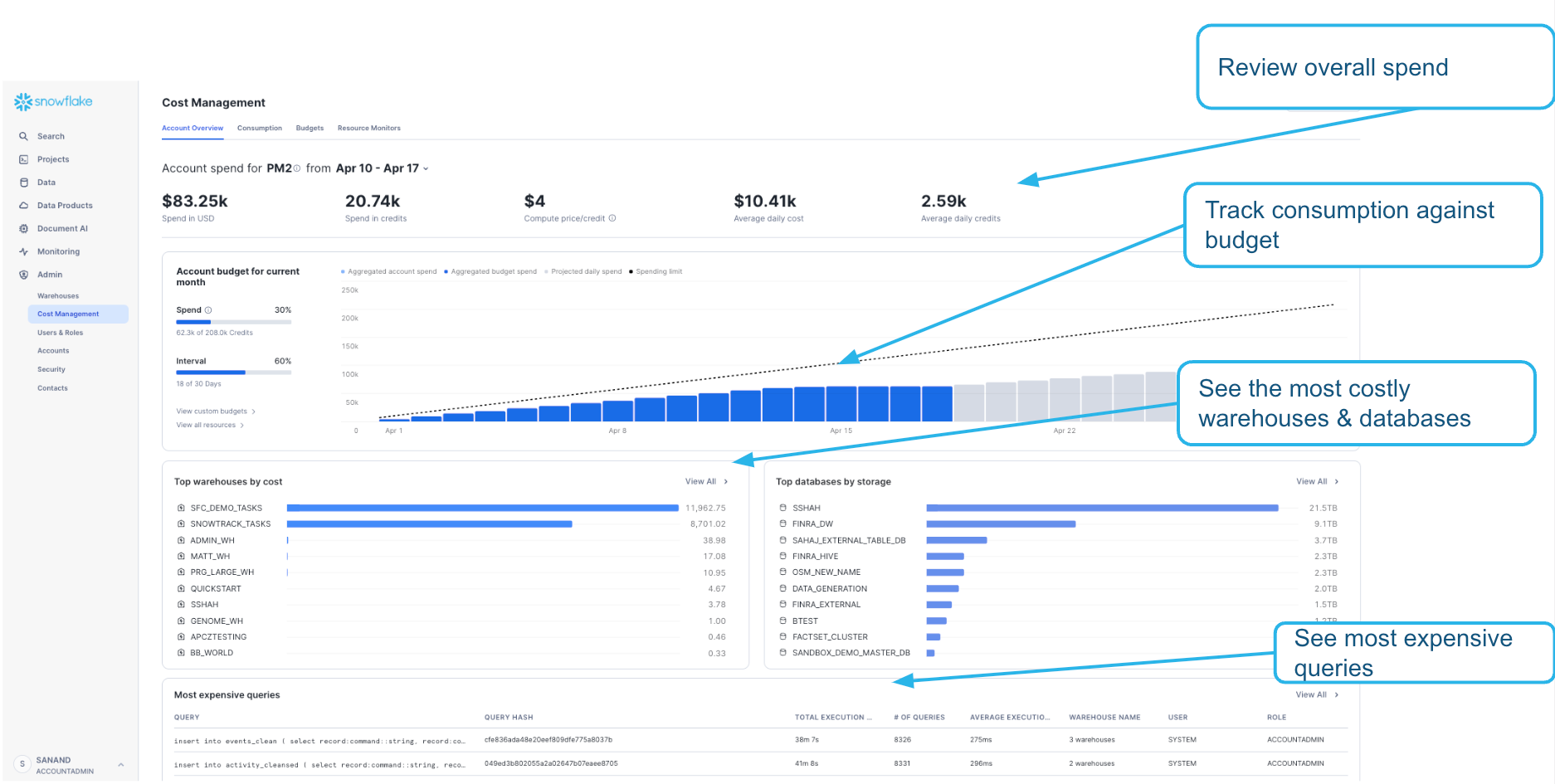- Identify top areas by spend: Pinpoint top areas of expenditure, including warehouses, queries and databases by storage.