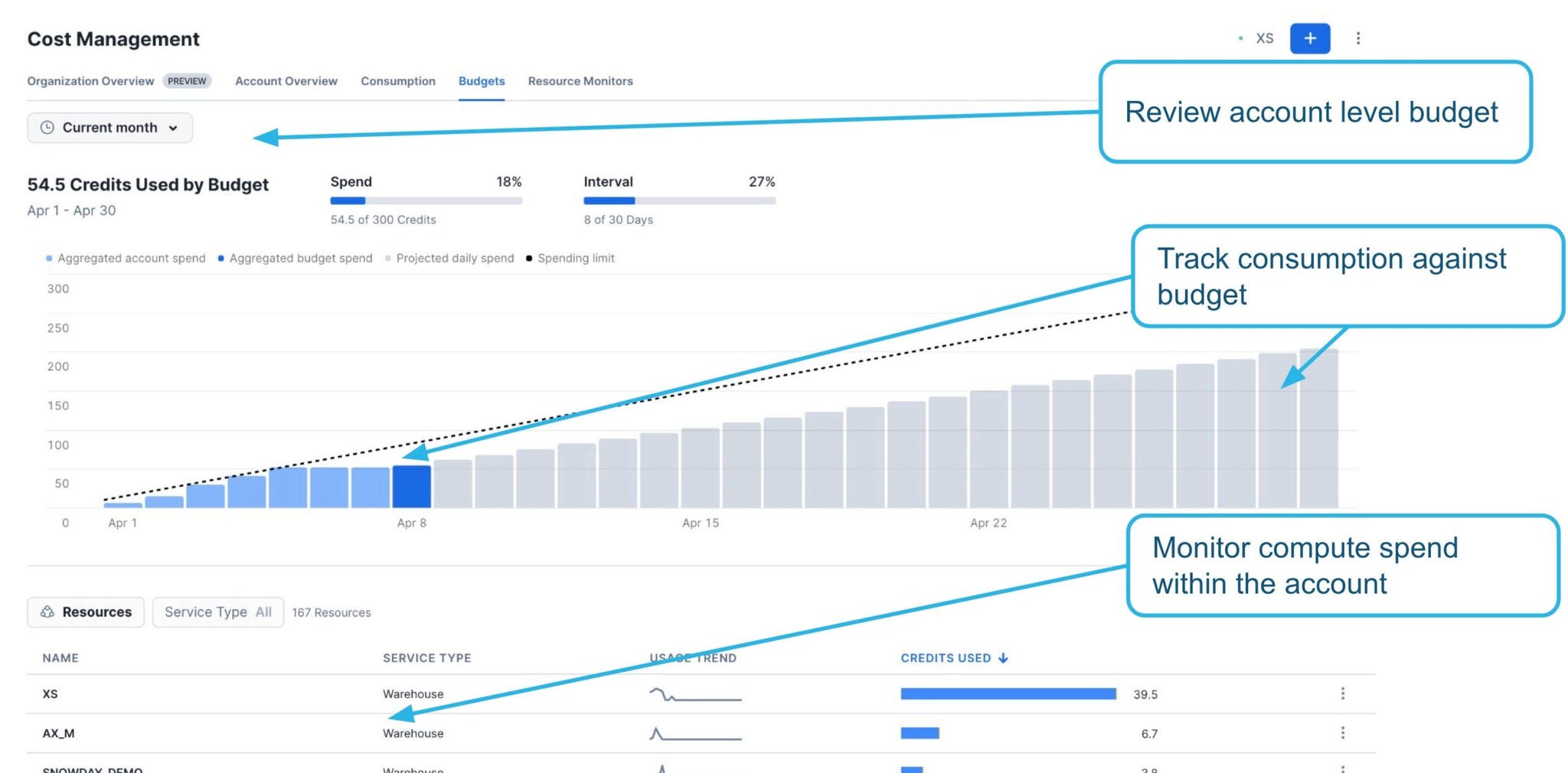 We are excited to also announce the Budgets feature in GA. As part of our public preview of Budgets, we received tremendous feedback, excitement and participation from customers. To recap, the Budgets feature is a cost control that monitors Snowflake compute credits across warehouses and serverless features (auto-clustering, replication, search optimization, etc.) within a Snowflake account.