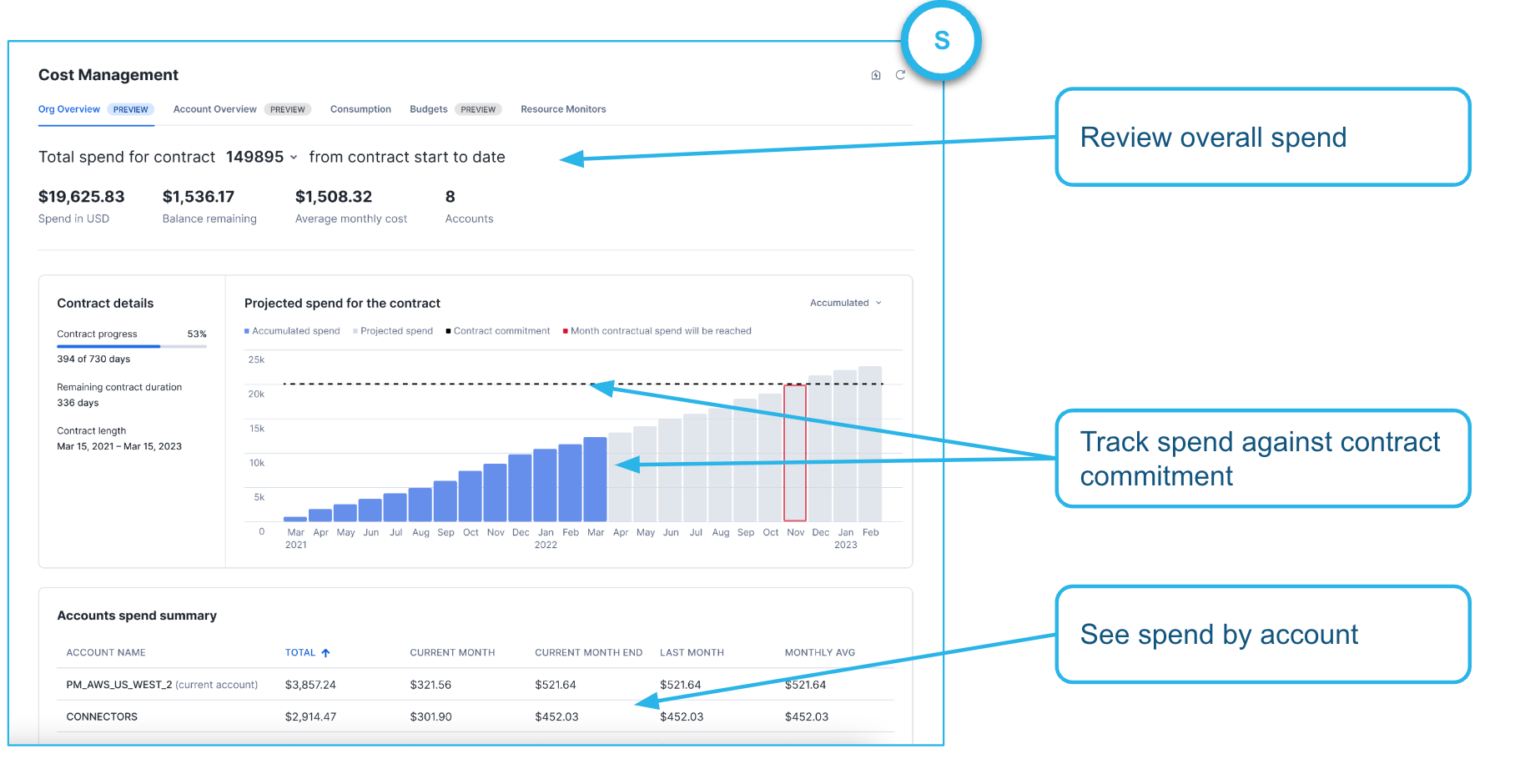 - Contract overview: Detailed insights into contract consumption and forecast, including accumulated actual spend vs. forecasted spend, contract progress details and contract length.
