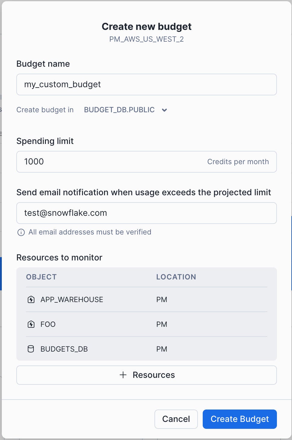 Or, you can create a budget for a group of resources (Snowflake objects) within your account, representing either a business unit, department or application, and track its spend against the spending limit allocated for that month.
