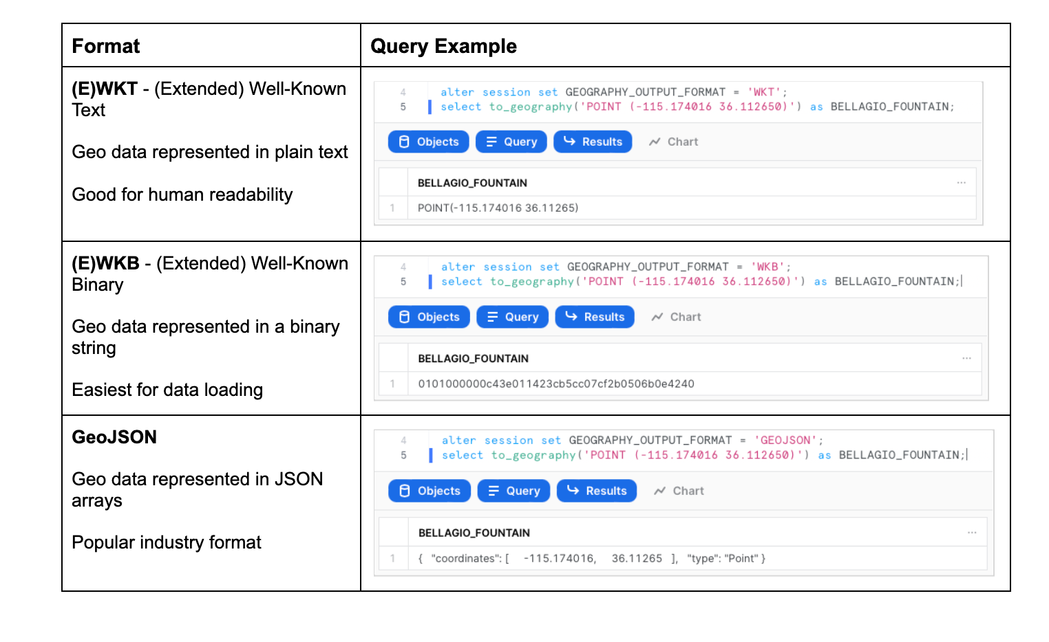 Let’s start with geospatial data formats. You can think of these formats as both input formats (loading data into the GEOGRAPHY data type) and output formats (how the data looks when queried from a GEOGRAPHY-typed column). There are three primary formats that Snowflake supports: (E)WKT - (Extended) Well-Known Text; (E)WKB - (Extended) Well-Known Binary; and GeoJSON. The table below shows the three formats and extended variants where applicable, as well as a query output representation of the longitude and latitude of the Bellagio Fountains (since the Snowflake Summit 2022 is in Las Vegas this year):
