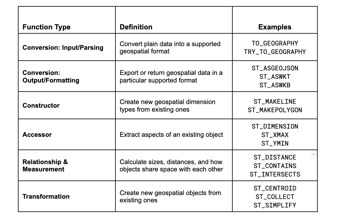 If you’re having nightmarish visions of grade school geometry class, don’t fret—Snowflake has your back on how to do all of those area, perimeter, and intersection calculations. Geospatial functions know how to operate on a GEOGRAPHY-typed object, and they make the calculations easy. Let’s take a look at the categories of geospatial functions and a few examples of each, and we’ll follow that with some examples of how to use them in SQL. If you want the full list of functions, you can find them here.