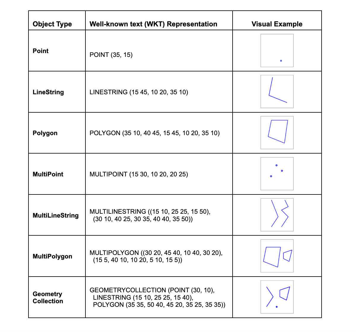 In the above output representations of the Bellagio Fountains, the output is showing a particular object type, or geospatial dimension type: a POINT. There are many different object types, some of which are singular objects, and others which are groupings of multiple objects, as shown in the table below: