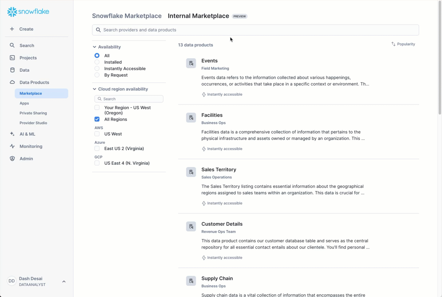 The Internal Marketplace (private preview) introduces a new way for customers to boost secure collaboration, through a single directory of all data products specifically curated for use within an organization. This is made possible with the introduction of Organizational Profiles and Listings, which can only be shared within an organization to prevent unintended exposure while providing rich metadata, such as data dictionaries, ownership, usage examples and usage analytics. Access to Organizational Listings can be granted granularly to individual roles within the source account, to a set of accounts or to the entire organization. In addition to sharing data and Snowflake Native Apps, data teams can now also use listings to easily share AI models (private preview soon), Iceberg Tables (generally available) and Dynamic Tables (generally available) across cloud regions.