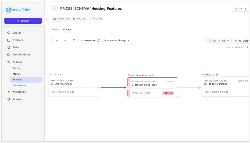 Snowflake Horizon helps organizations successfully perform internal and external compliance reviews and audits with built-in lineage and data-quality monitoring. For data governors and stewards to better understand upstream and downstream relationships for root cause analyses, Snowflake is expanding the Lineage Visualization Interface beyond data objects, like tables and views (public preview soon), to ML assets (private preview). For tables and views, they can see downstream objects impacted by modifications and follow intuitive UI workflows to propagate tags to protect downstream columns with PII. For ML assets, they can trace end-to-end feature and model lineage, from data to insight, for reproducibility, stronger compliance and simplified observability.