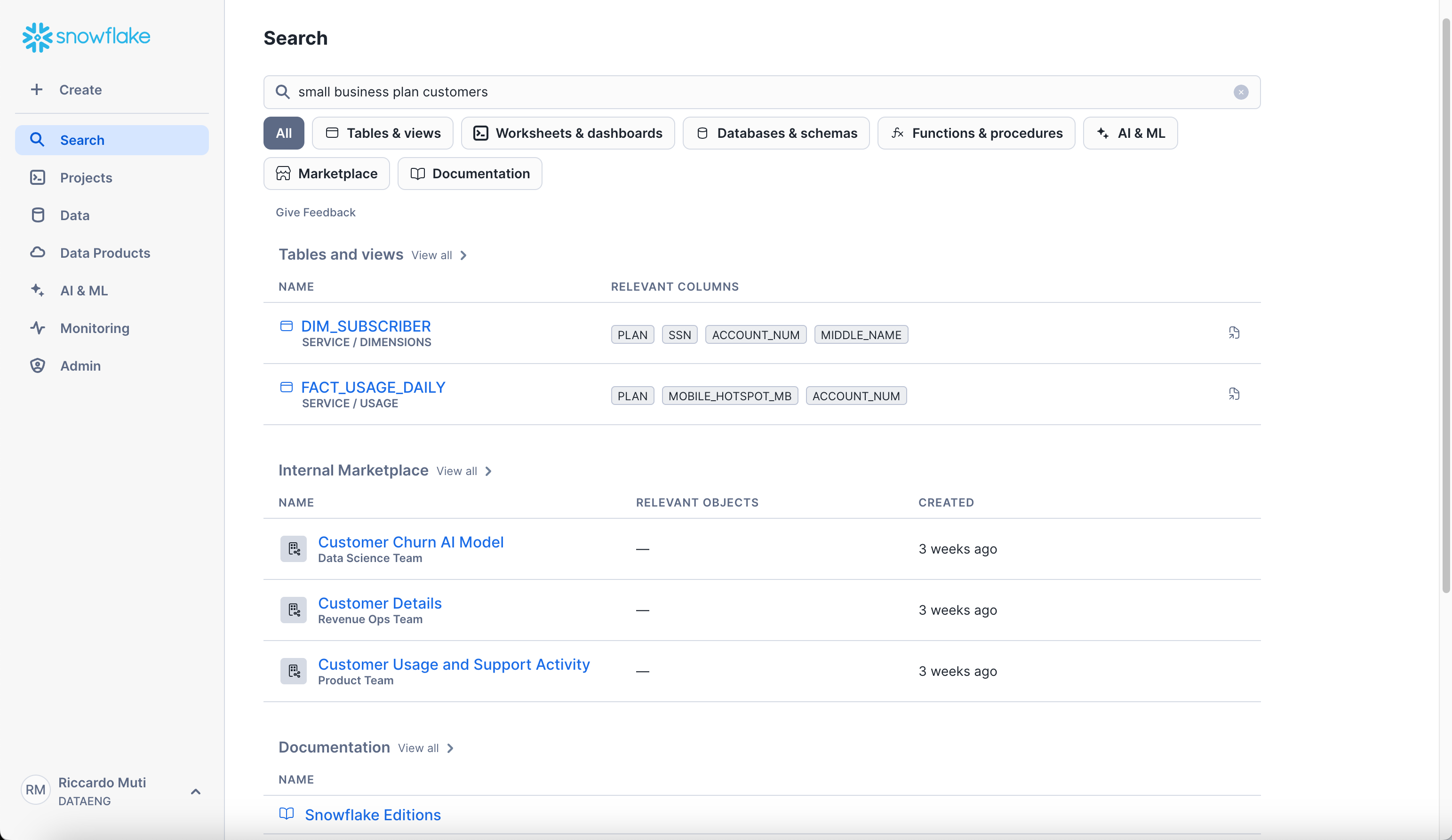 Universal Search (generally available) leverages AI so anyone can now use natural language to search and discover tables, views, databases, schemas, Iceberg tables, Snowflake Marketplace listings, Snowflake documentation, and now also worksheets, dashboards and content from.
