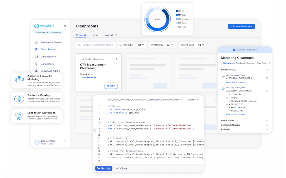 Snowflake is revolutionizing how technical and nontechnical users are collaborating on sensitive data while preserving privacy through out-of-the-box templates and a no-code UI in Snowflake Data Clean Rooms. In December 2023, Snowflake announced its acquisition of data clean room technology provider Samooha. Now, Samooha’s offering is integrated and available as Snowflake Data Clean Rooms, generally available to customers in select regions. Nontechnical teams can easily leverage prebuilt templates and deploy machine learning models for key multiparty collaboration use cases such as look-alike modeling, audience overlap, last-touch attribution and more. Developer APIs allow for clean room customizations and deployment of any AI model. Learn more in the blog.