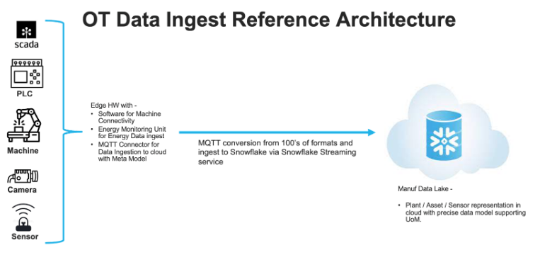 Given the complexity of ingesting OT systems data in near real time, Snowflake is establishing a standardized reference architecture. Working with our partners, this standardized reference architecture provides edge connectivity hardware supporting edge analytics, in addition to being a gateway device. Working with our partners, this architecture includes MQTT-based data ingestion into Snowflake. This provides a highly scalable, fast, flexible (OT data published by exception from edge to cloud), and secure communication to Snowflake. This publish action of OT data also preserves plant/asset data models with metadata, driving important business outcomes for manufacturers such as energy and asset performance optimization, predictive maintenance, and predictive quality—all enabled through the application of this integrated data architecture.