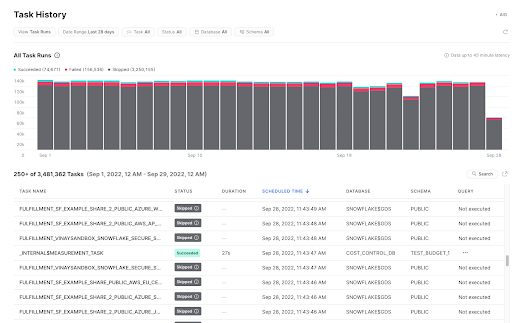 How do you know if a task has been running successfully, is failing, or is even scheduled to run in the future? Click on the “Run History” tab. Want to drill down into the data without having to write code? Just click on a bar, click on the legend, or use the filters in the upper right. What if you want to see a query of a failed run? You can effortlessly jump directly from a task run to the query profile.