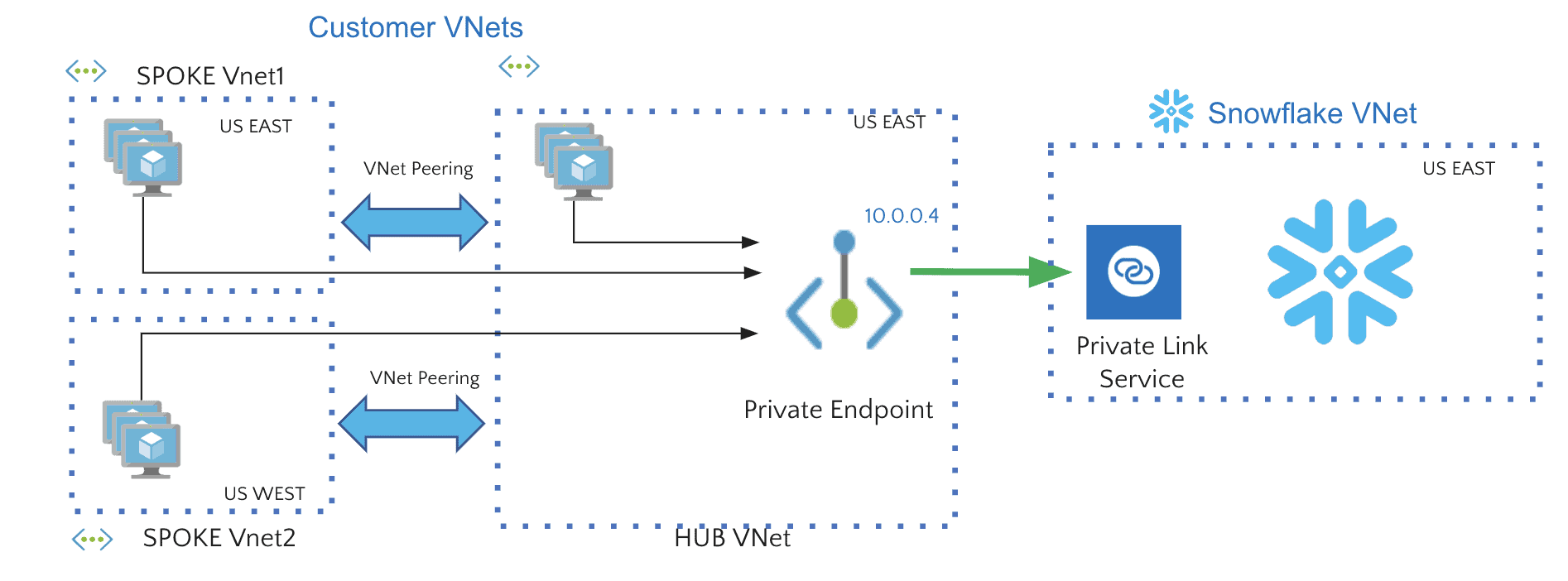 You can set up a hub-and-spoke network topology where one VNet is used to connect to Snowflake in the same region. The rest of the VNets in the same region or across regions are peered to this hub VNet.