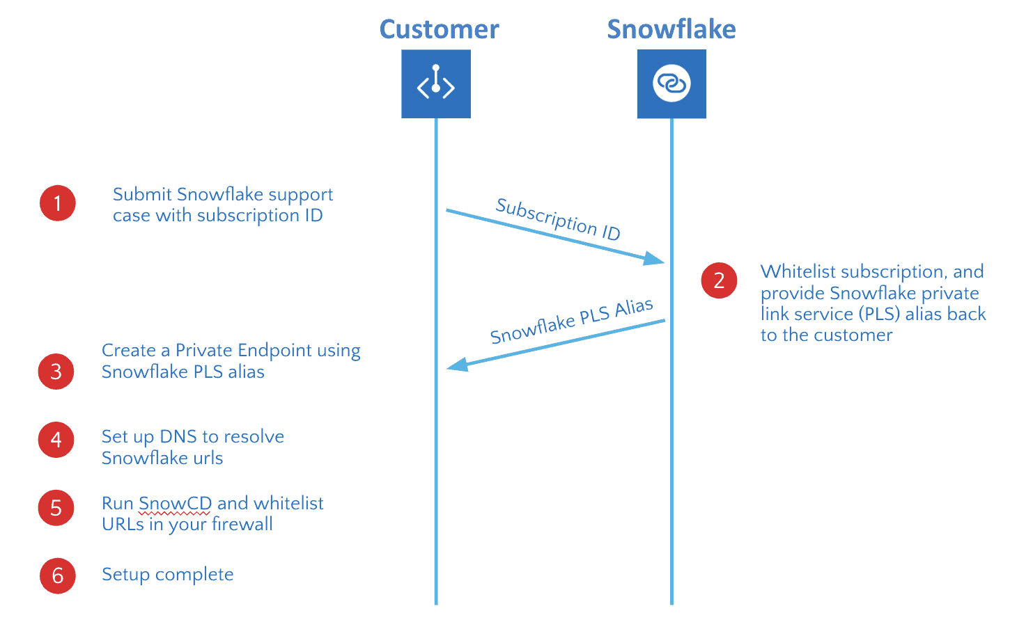 - The Snowflake account appears as a private IP address in the customer’s VNet.
