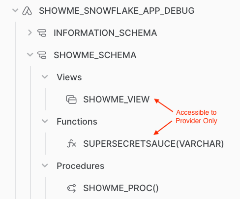 When installed in the consumer account, the views and functions were configured to not be accessible. The SHOWME_VIEW and SUPERSECRETSAUCE can still be used by the SHOWME_PROC during execution, but the existence of and the code backing all these objects is protected.