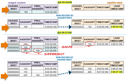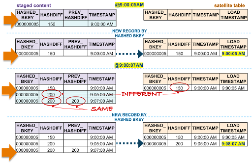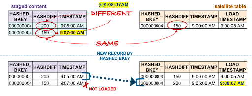 - The oldest staged record has the same hashdiff as the current record in the target satellite. This record will not be inserted to the target satellite table.