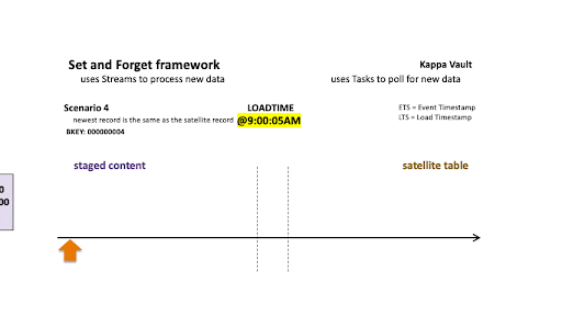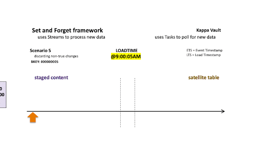 Streams ensure we reduce the volume of records being processed so the above two operations are not processing all the landed content, just the newest data since the last stream ingestion event. For this and all scenarios below, the first record is always inserted because that business object did not exist in the target satellite at the time of load at 9:00:05 AM.