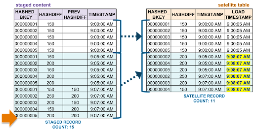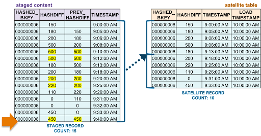 - The oldest staged record has a different hashdiff as the current record in the target satellite table. This record will be inserted into the target satellite table.
