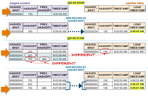 - The oldest staged record has a different hashdiff as the current record in the target satellite. This record will be inserted into the target satellite table.