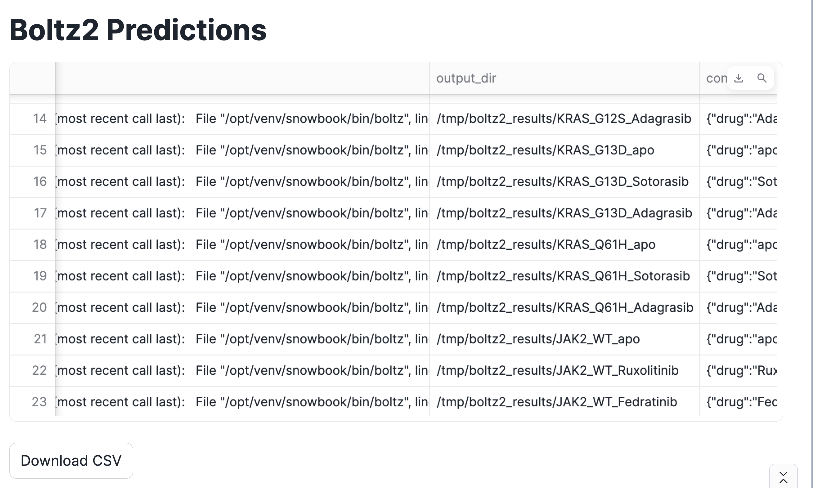 - A Snowflake Notebook that runs 29 Boltz2 protein structure predictions and displays results in a Streamlit dashboard