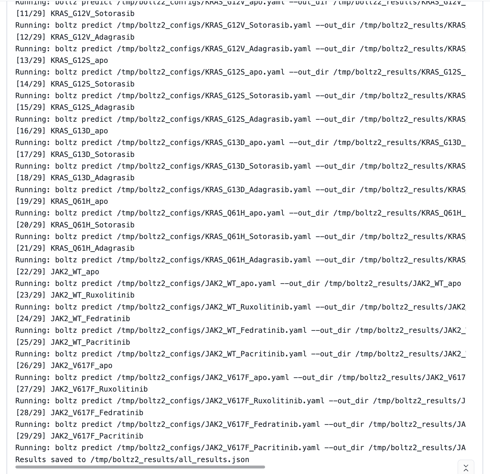 Congratulations! You have successfully run Boltz2 protein structure predictions for 29 KRAS and JAK2 configurations on a Snowflake GPU Notebook, including a compatibility fix for the flash-attn library and a Streamlit dashboard for results visualization.