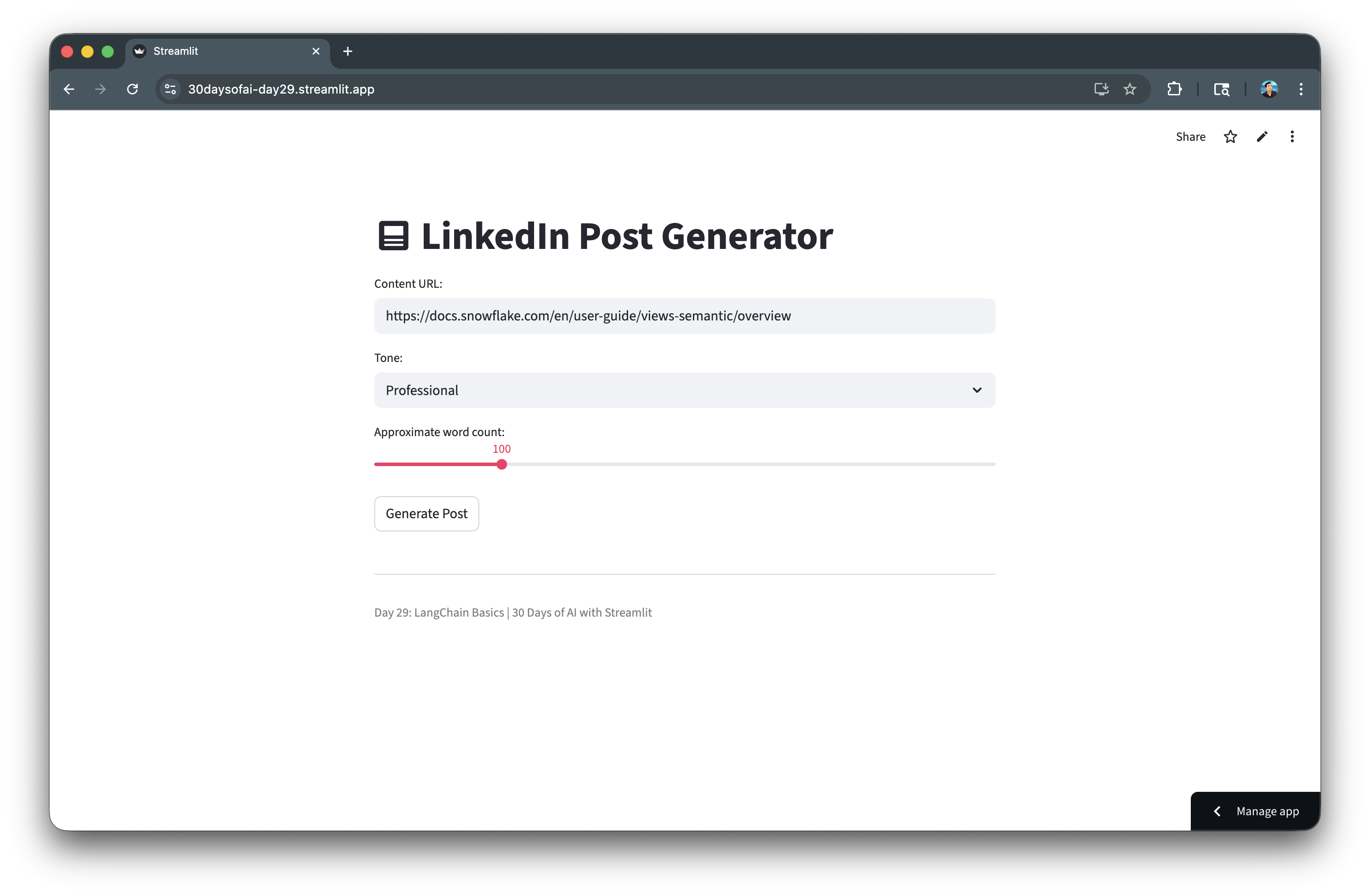 Here's the complete LinkedIn Post Generator combining LangChain prompt templates, Snowflake Cortex integration, and Streamlit UI controls.