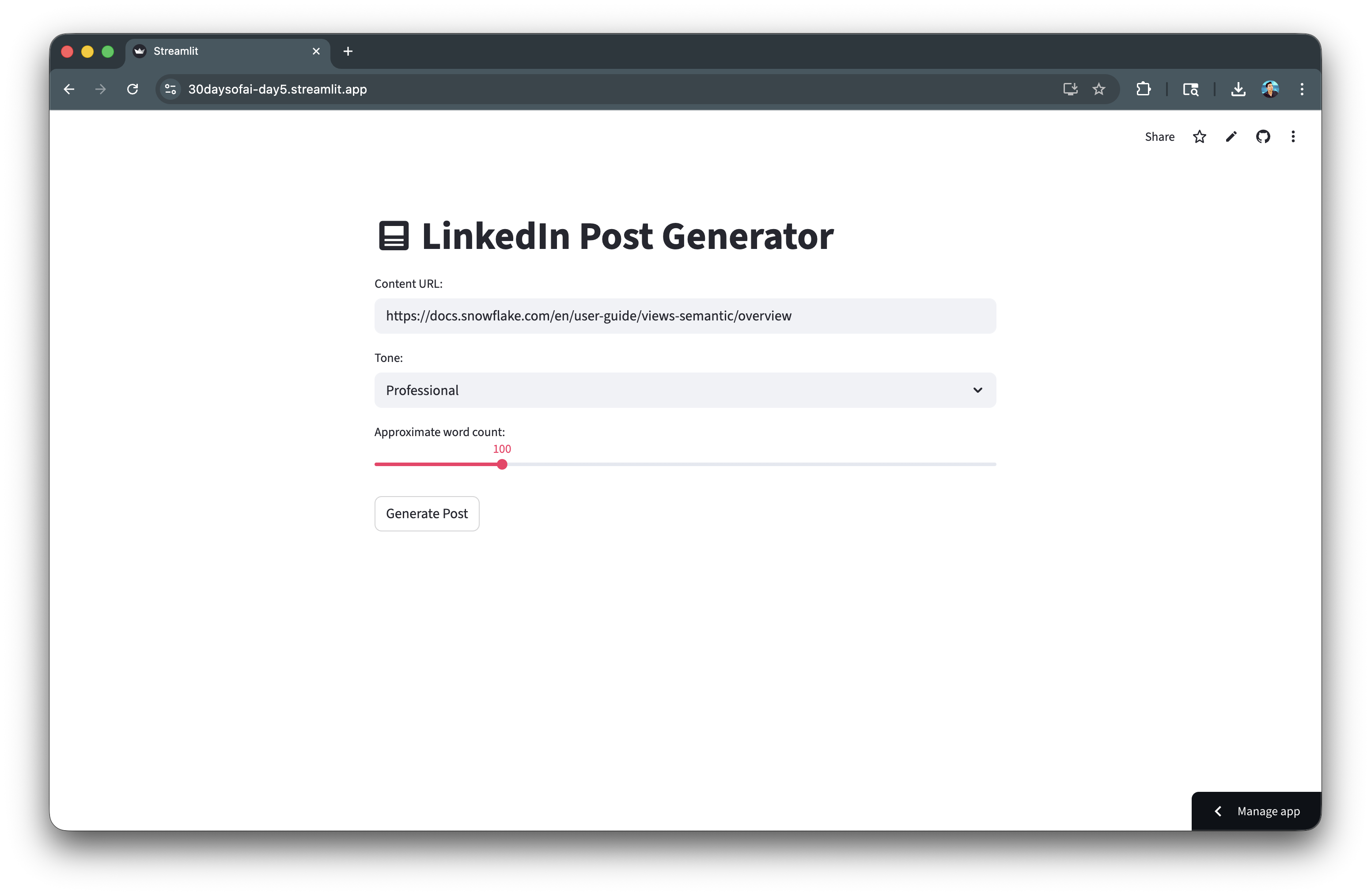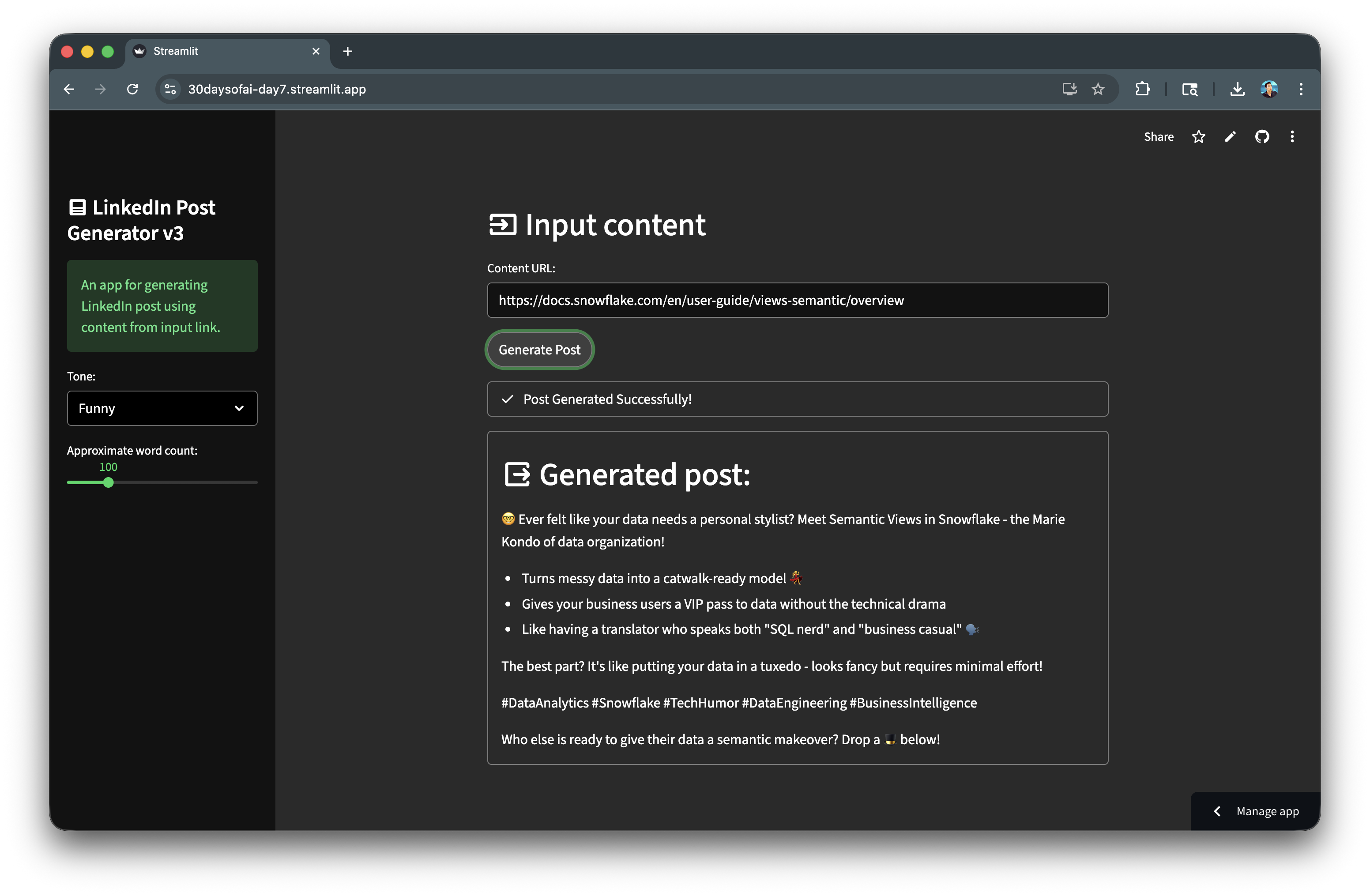 This progression takes you from a simple database connection to a production-ready LinkedIn Post Generator that uses Snowflake Cortex to generate social media content based on user-specified URLs, tone, and word count preferences.