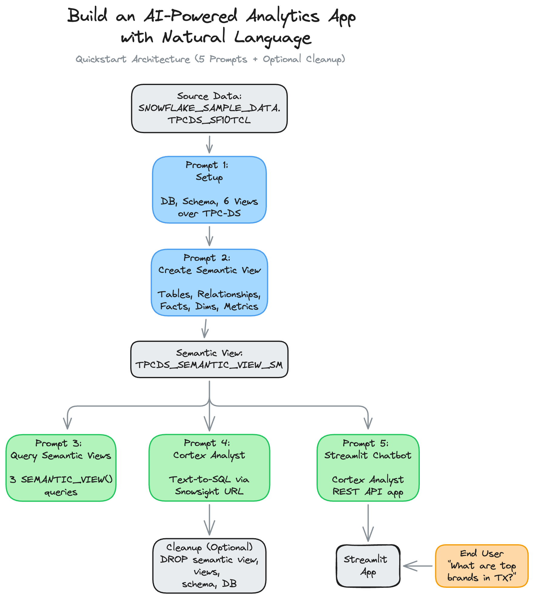 This workflow removes the biggest bottleneck in analytics: translating business questions into code. Instead of writing complex multi-table JOINs, you define the business model once in a semantic view and let AI handle the rest. Non-technical users can then ask questions in plain English through the chatbot, reducing the back-and-forth between analysts and stakeholders.