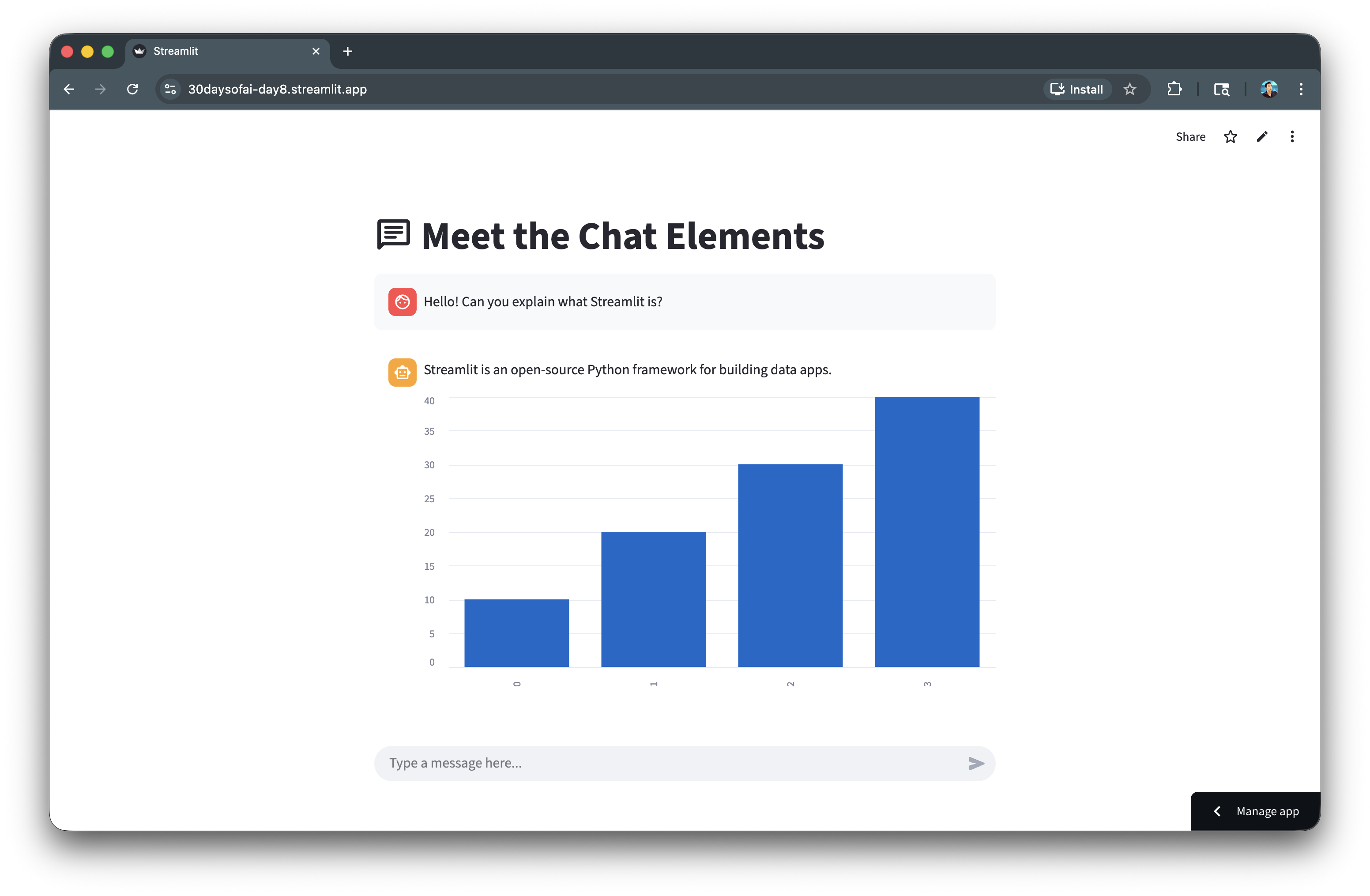 import streamlit as st st.title(":material/chat: Meet the Chat Elements") with st.chat_message("user"): st.write("Hello! Can you explain what Streamlit is?") with st.chat_message("assistant"): st.write("Streamlit is an open-source Python framework for building data apps.") st.bar_chart([10, 20, 30, 40])