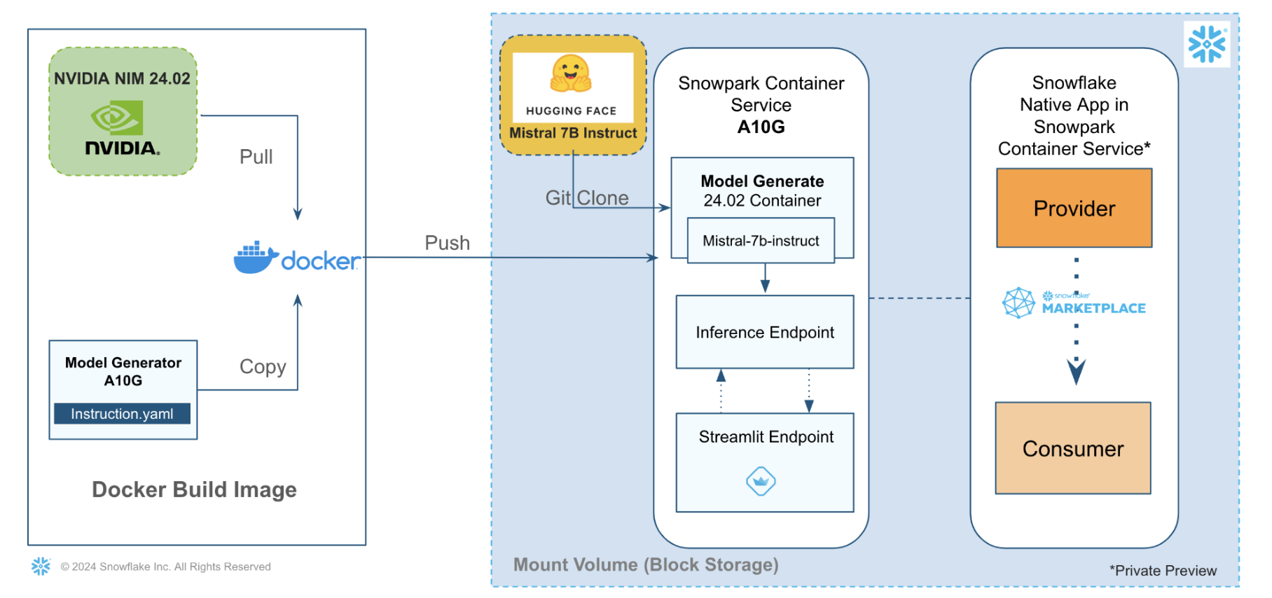 - In this use-case, we leverage Snowpark Container Services to run a Model Generator container. It downloads the Mistral-7b-Instruct from HuggingFace and shrinks it using NVIDIA NIM,