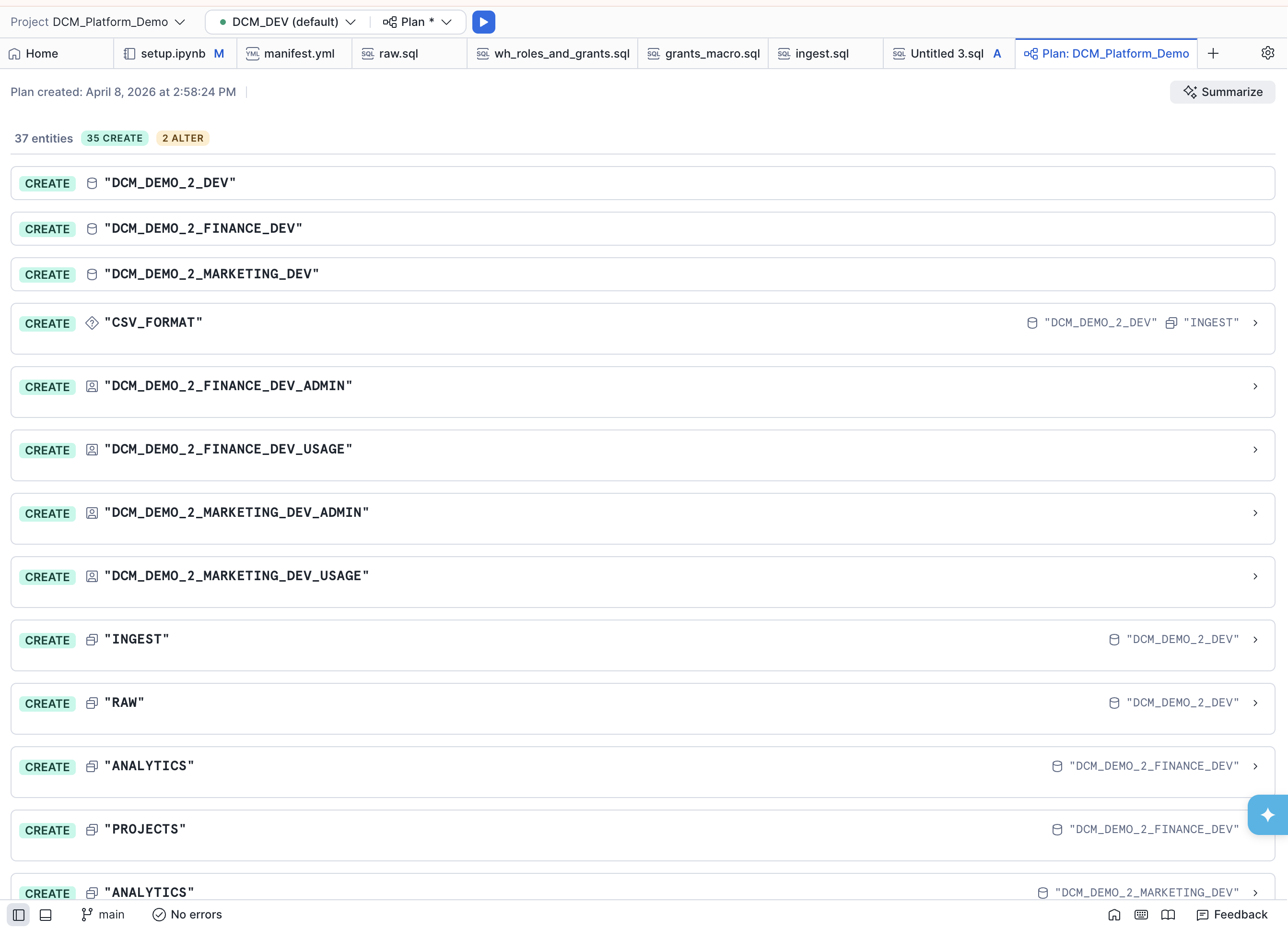 - DCM_Platform_Demo — Defines shared platform infrastructure: a database, raw staging tables, an ingestion stage and Task, warehouses, roles, and grants