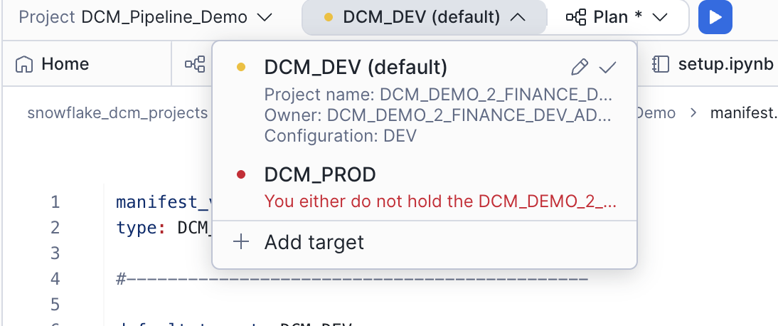 DCM_DEVtarget is selected and it points toFINANCE_PIPELINE. - In the manifest file, update the default value for